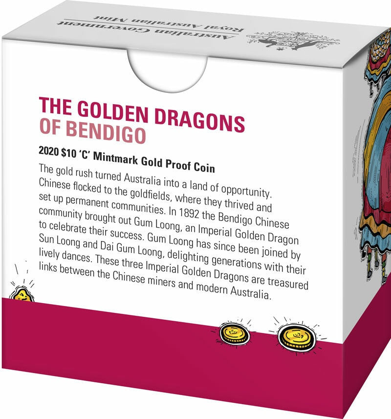 The contributions made to Australia’s development by new and growing communities during the gold rushes, are celebrated in this stunning 2020 $10 ‘C’ Mintmark gold proof coin.