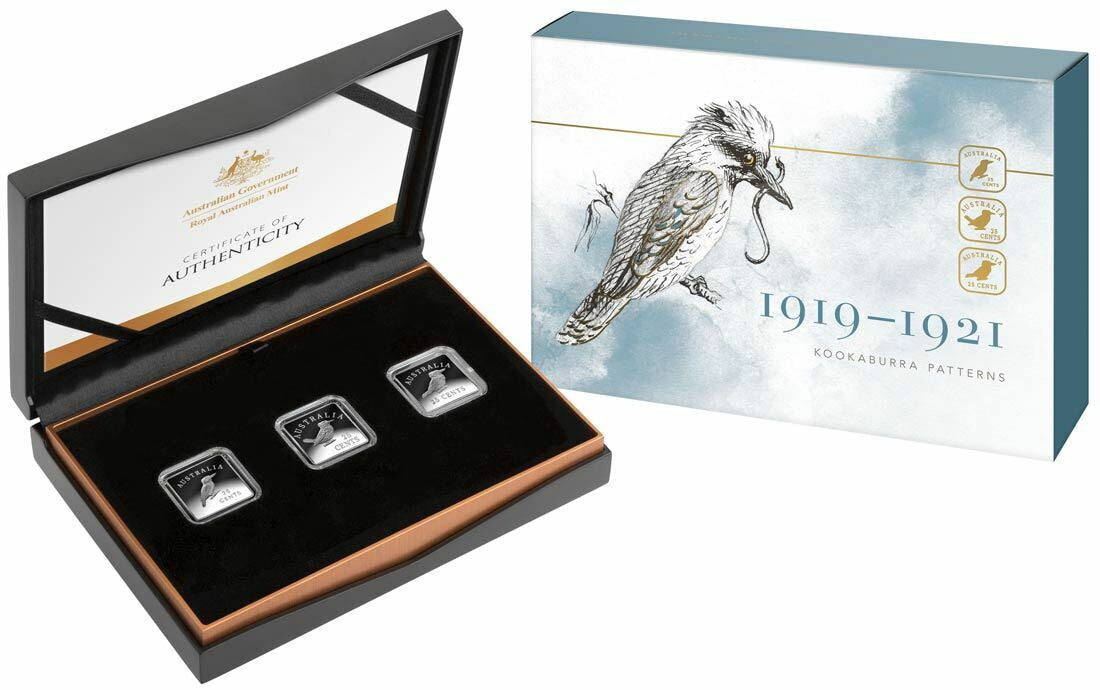 2019 25c 1/4oz Silver Proof Three Square Coin Set - Centenary of the Kookaburra Pattern Pieces