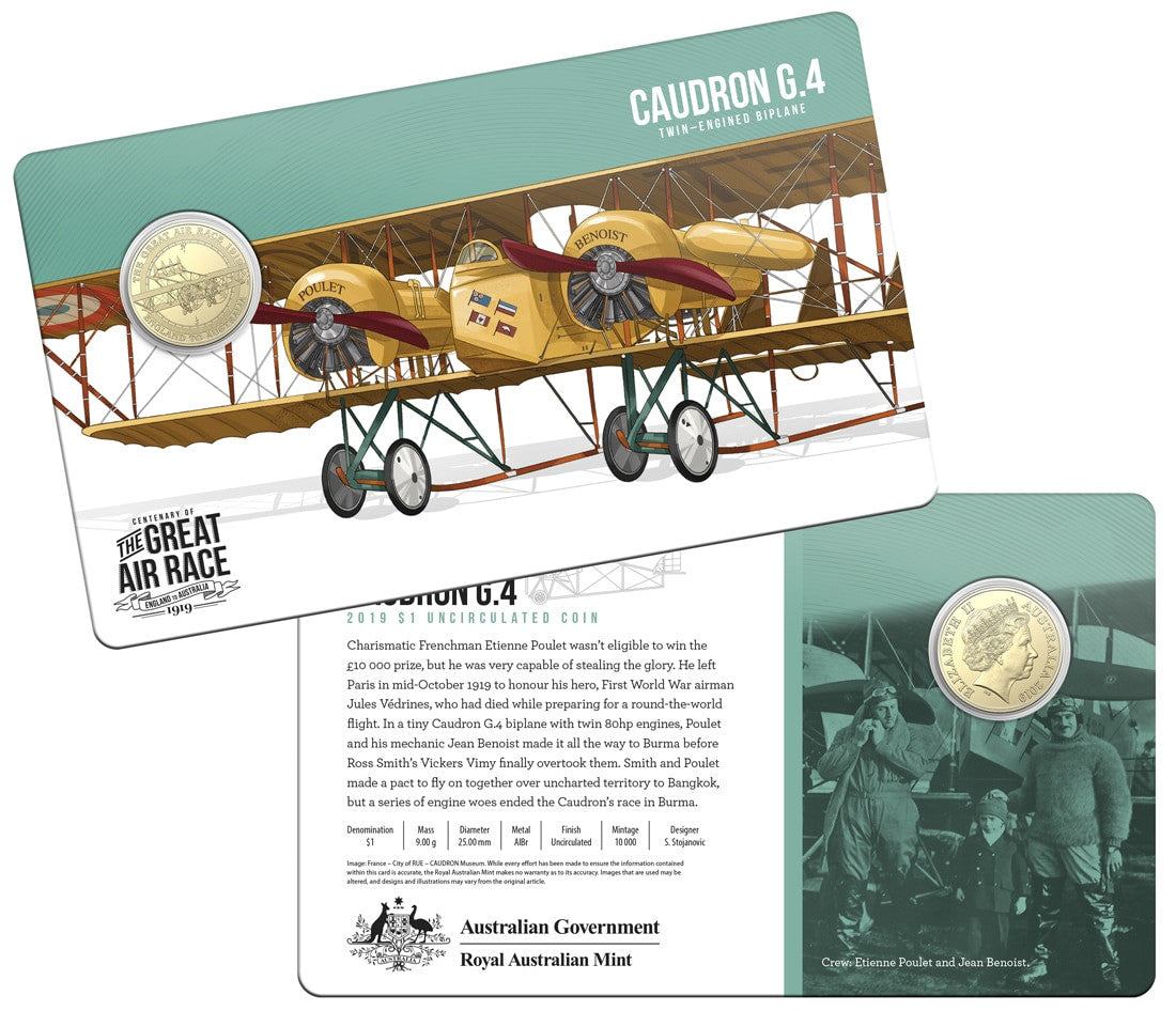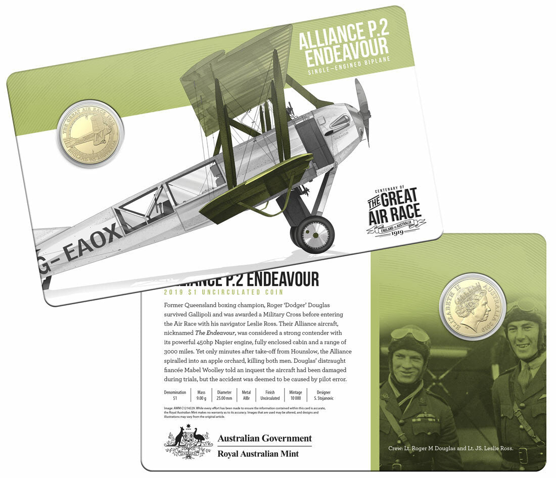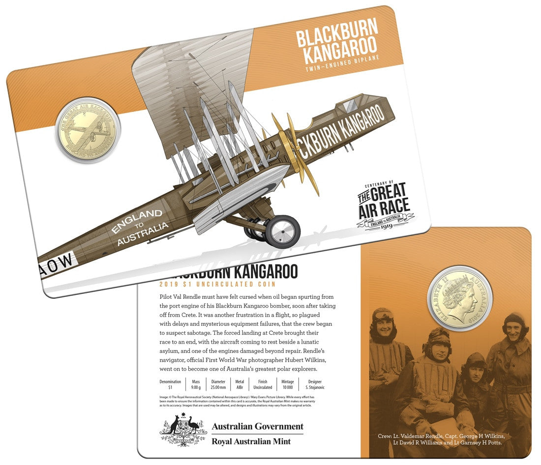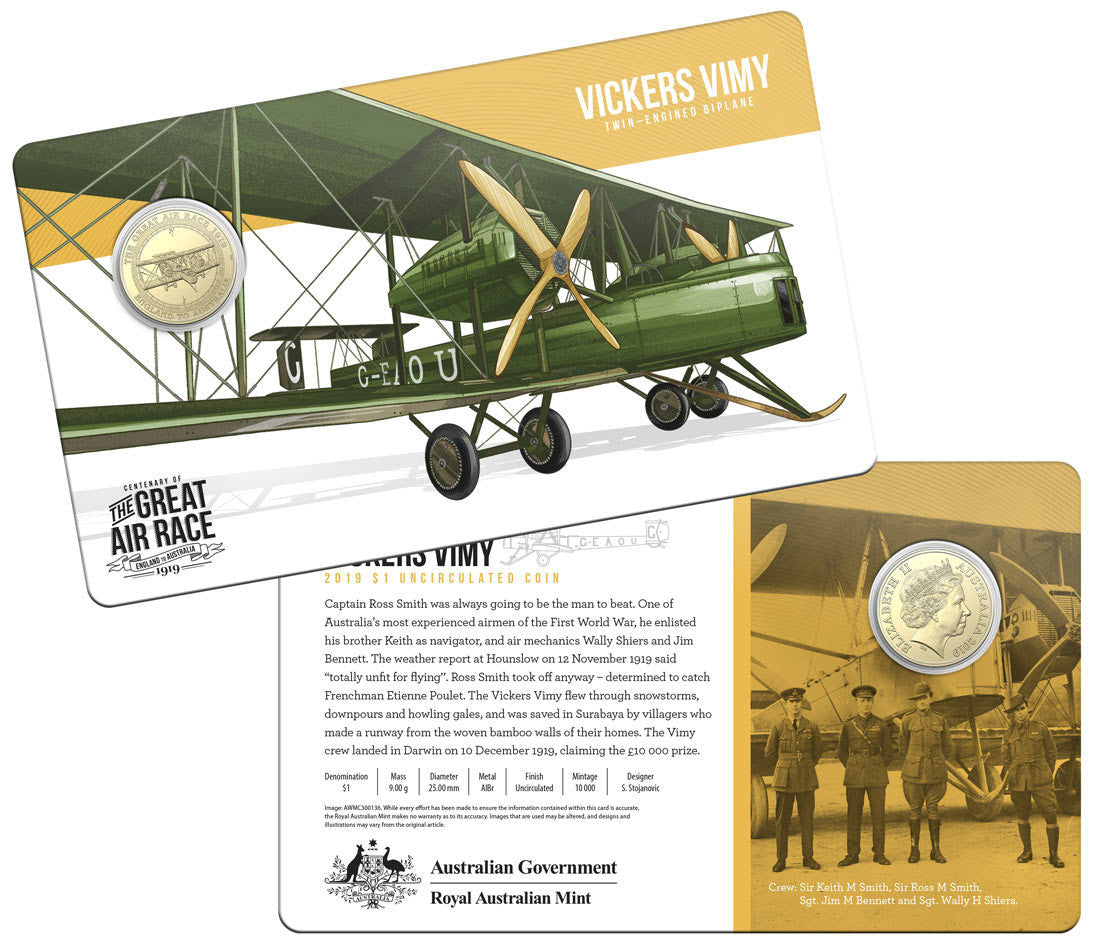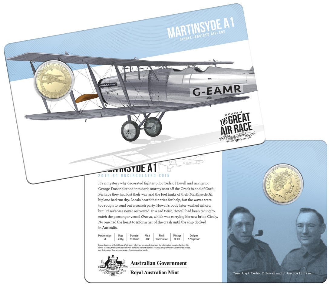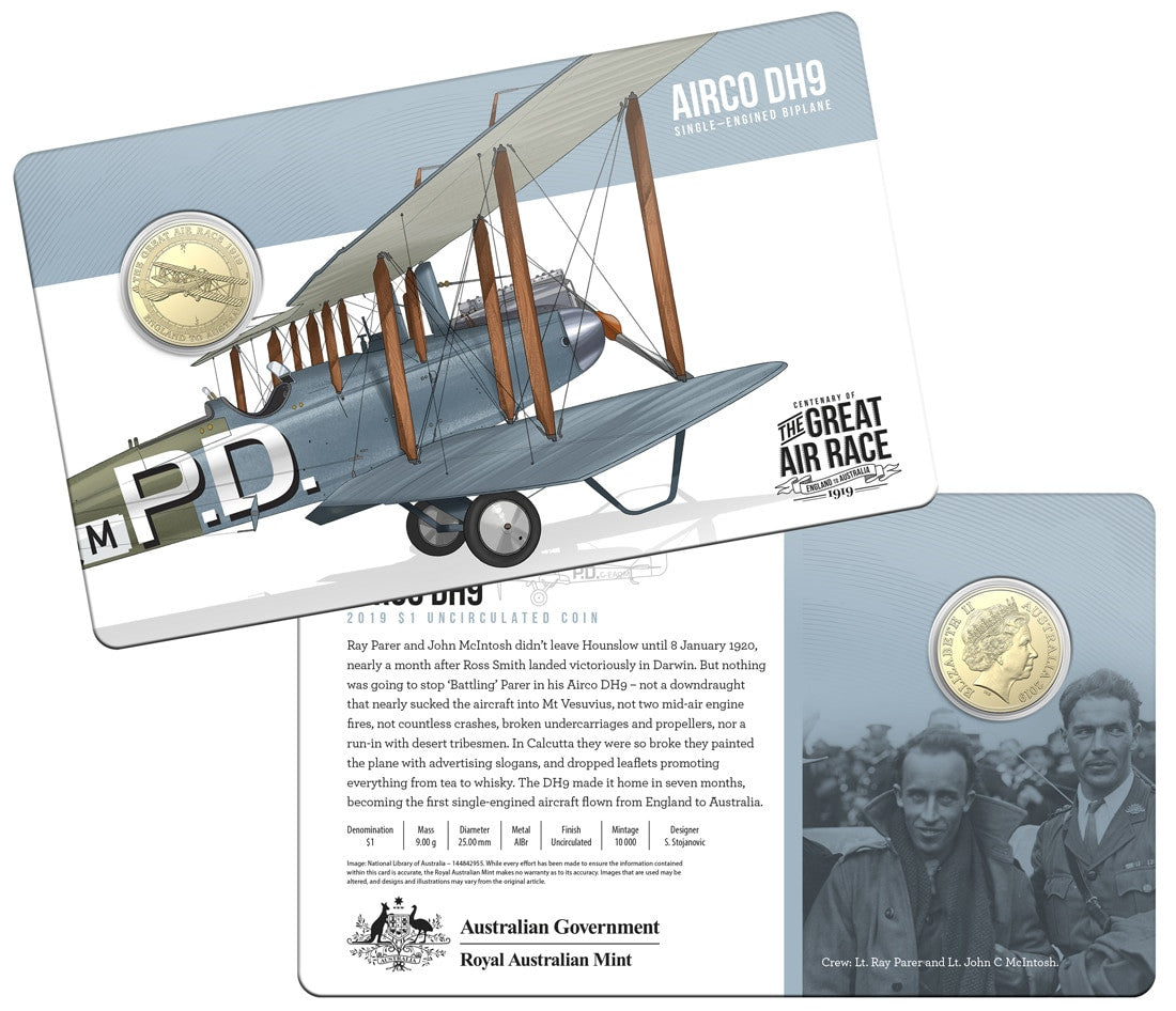 In 1919, six Australian air crews took to the skies in the world’s most dramatic air ace to date, racing to be the first to fly from England to Australia in 30 days. The excitement, drama and tragedy of the Great Air Race is commemorated in this set of eight stunning 2019 $1 uncirculated coins, packaged in a collectible tin.
