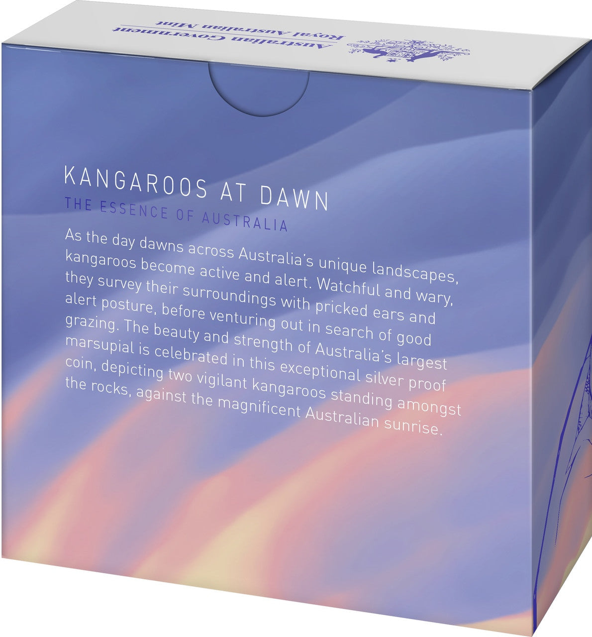 The $1 1/2oz silver proof coin features two kangaroo at dawn, just as they start to become active. They are poised against a rising sun, surrounded by unique rock formations and vegetation. With their ears pricked, the kangaroos survey their surroundings for danger before moving out to graze. Their beauty and strength, combined with the tranquil stillness of dawn are magnificently rendered in this fine silver collectible.