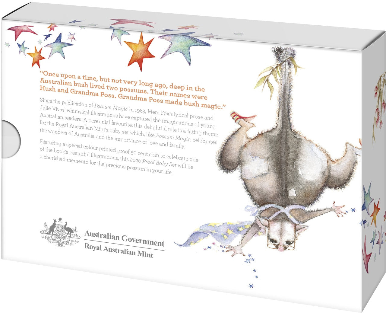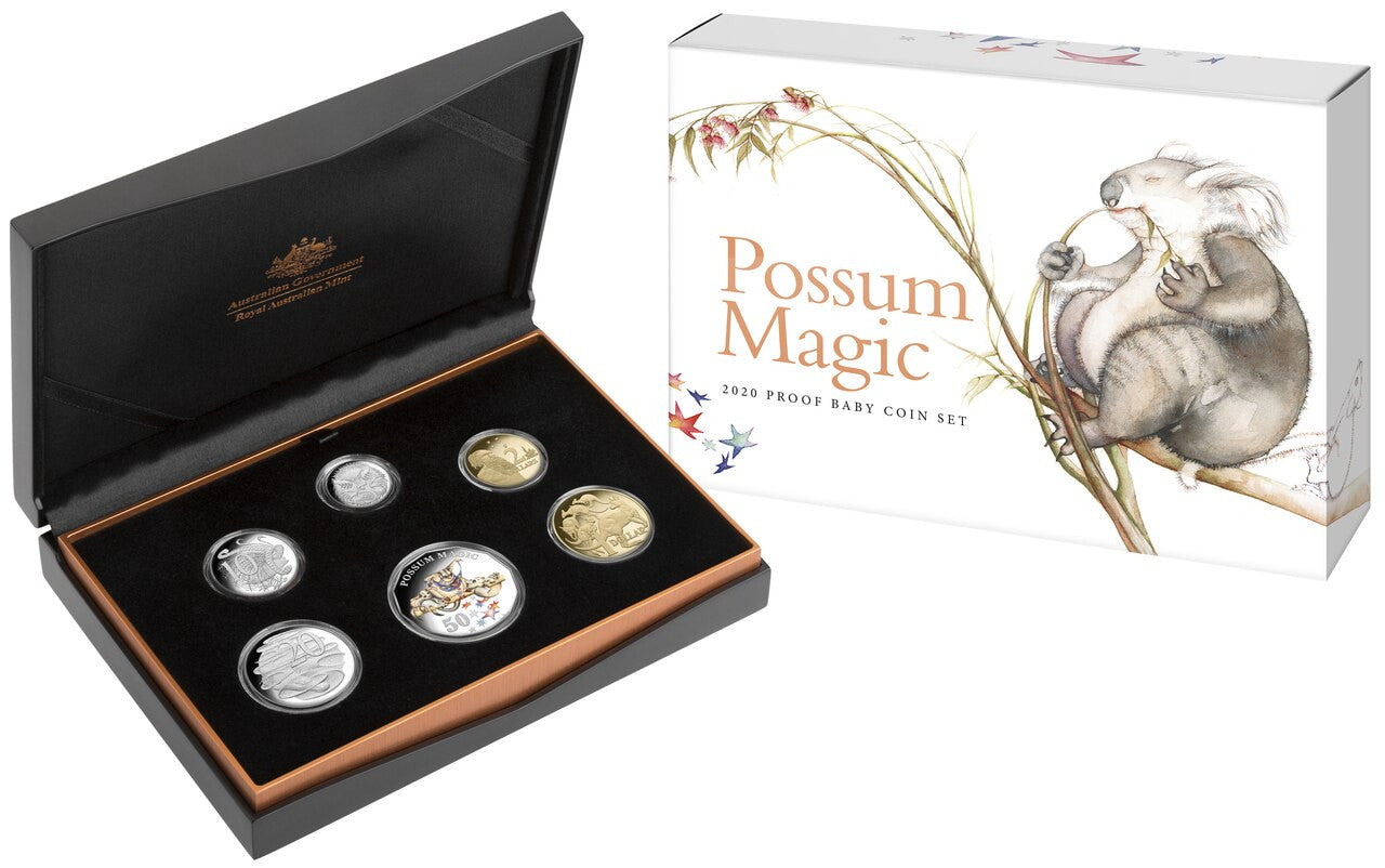 In 1983 the whimsical children’s book Possum Magic was released, delighting young readers with its tale of Hush and Grandma Poss, two possums who travel Australia in search of a magical delicacy. The Royal Australian Mint’s 2020 baby year set will feature this beloved book for the third and final year.