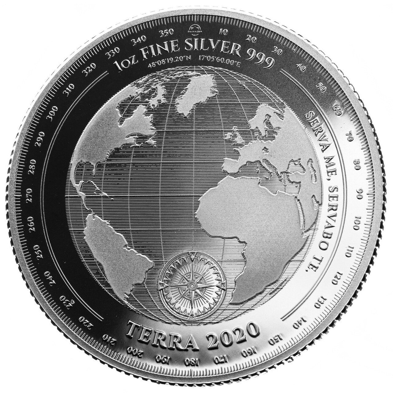 Reverse: 1oz FINE SILVER, TERRA 2019 SERVA ME, SERVABO TE. (latin Protect me, I will protect you), Map of Europe, Americas and Africa, GPS of Bratislava, Compass, stylised compass numbering.
