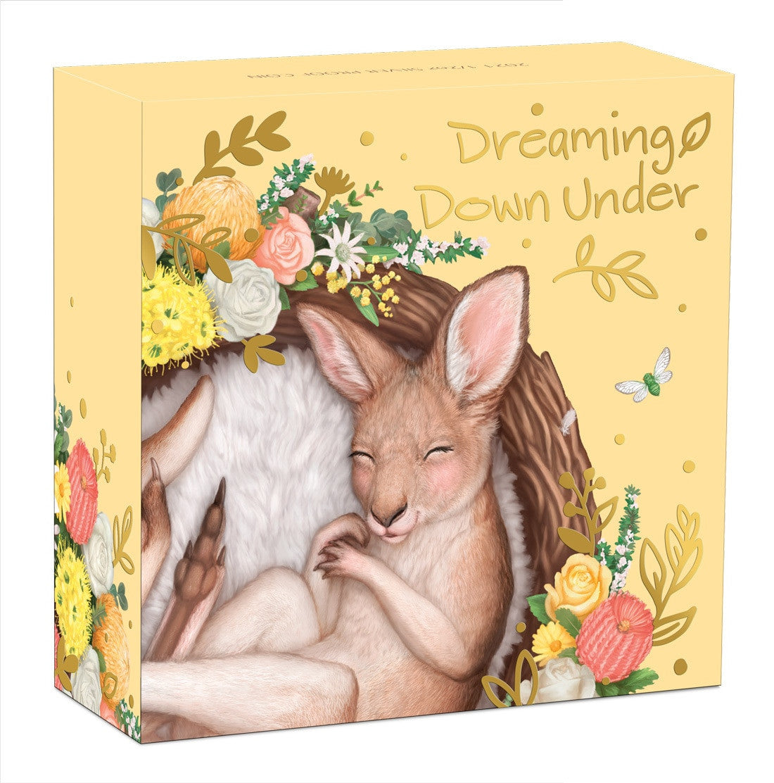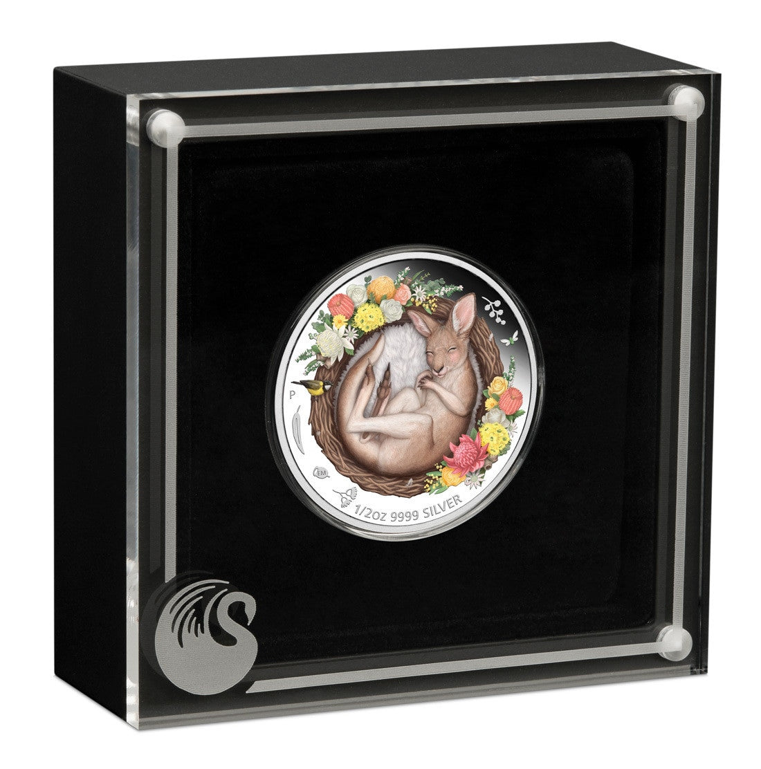 The coin’s reverse depicts a cute baby kangaroo asleep in a fleece-lined nest surrounded by colourful Australian native flowers and wildlife. The Perth Mint’s ‘P’ mintmark also appears on the reverse with the coin’s weight and purity.