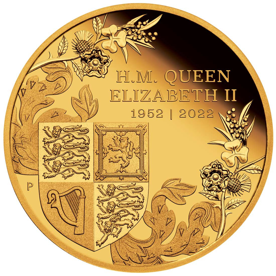 The coin’s reverse portrays the Shield of the Royal Coat of Arms featuring three lions passant, a harp, and a lion rampant – ancient heraldic symbols of England, Ireland and Scotland. A figurative flower stem combines stylised representations of an English rose, Irish shamrock and Scottish thistle, together with Australian wattle. Also included in the design is the inscription ‘H.M. QUEEN ELIZABETH II 1952 | 2022’, The Perth Mint’s ‘P’ mintmark, and an artistic interpretation of the mantle from the Royal Arms – originally a linen cover on the back of a medieval knights helmet.