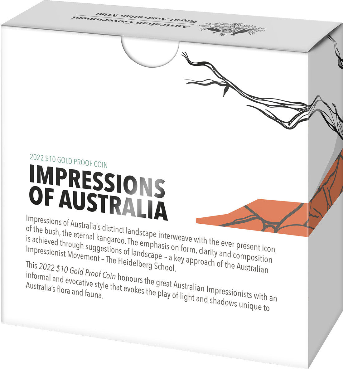 This 2022 $10 1/10oz Gold Proof Coin honours the great Australian Impressionists with an informal and evocative style that evokes the play of light and shadows unique to Australia's flora and fauna.