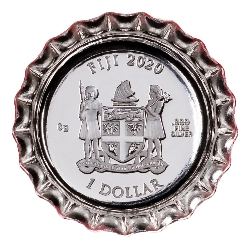 Minted with 6g of pure silver, each coin's unique “bottle cap” shape is an exacting tribute to the little red and white caps that sit atop the famous Coca-Cola contour bottle. No matter where you are in the world, just flip one over, and you'll discover the coin’s weight, purity, date of issue and $1 legal-tender value.
