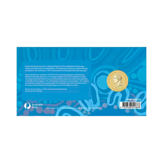 Paying tribute Whadjuk boodja, this stamp and coin cover from Australia Post features original artwork by Whadjuk-Yuet-Ballardong artist Kevin Bynder.