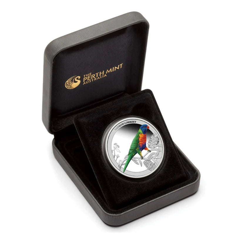 This coin the fourth in a 5-coin Birds of Australia series depicts a full colour Rainbow Lorikeet.