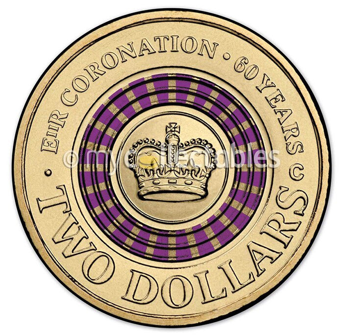 To honour the 60th anniversary of this momentous event that began one of the longest reigns in British history, the Royal Australian Mint has released a commemorative $2 colour printed ‘C’ mintmark uncirculated coin with the same design as the circulating coin. This coin is a great memento for the royal fans as well as the coloured coin collectors. The design features a stylised representation of St Edward’s Crown surrounded by circles including a pattern of purple coloured, the colour synonymous with royalty stripes.