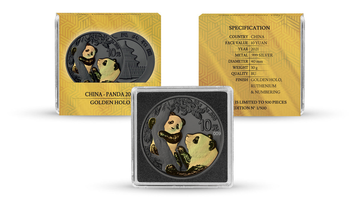 The China Panda is a bullion coin, released annually by the Central Mint of China. Adaptation of this coin - the Golden Holo - is a version in which gold-colored hologram effect and ruthenium is used to highlight coin’s details. The Panda refined with golden holo shimmers with different colors, depending on the incident light. This effect was further emphasized by the use of ruthenium in the background.