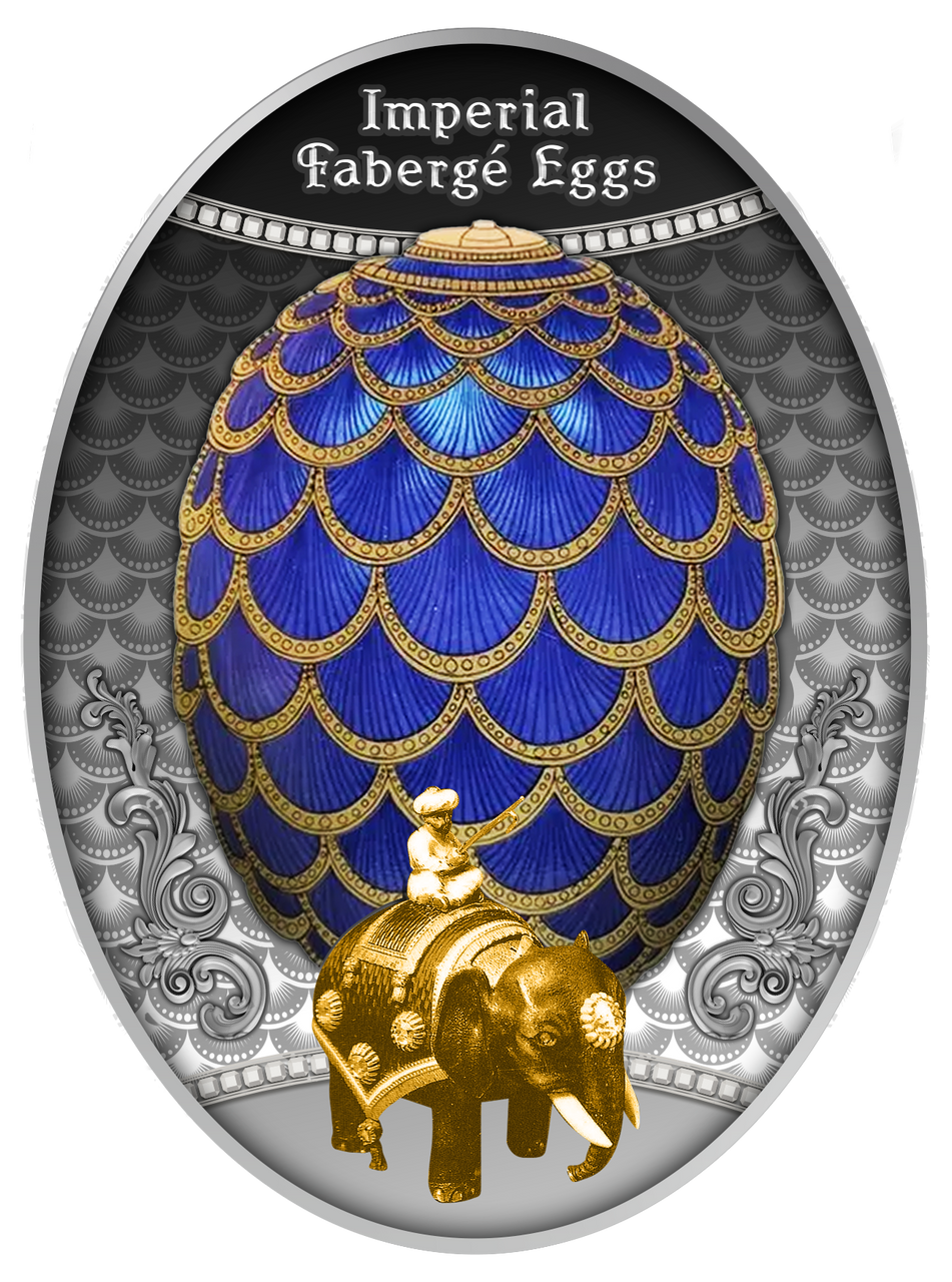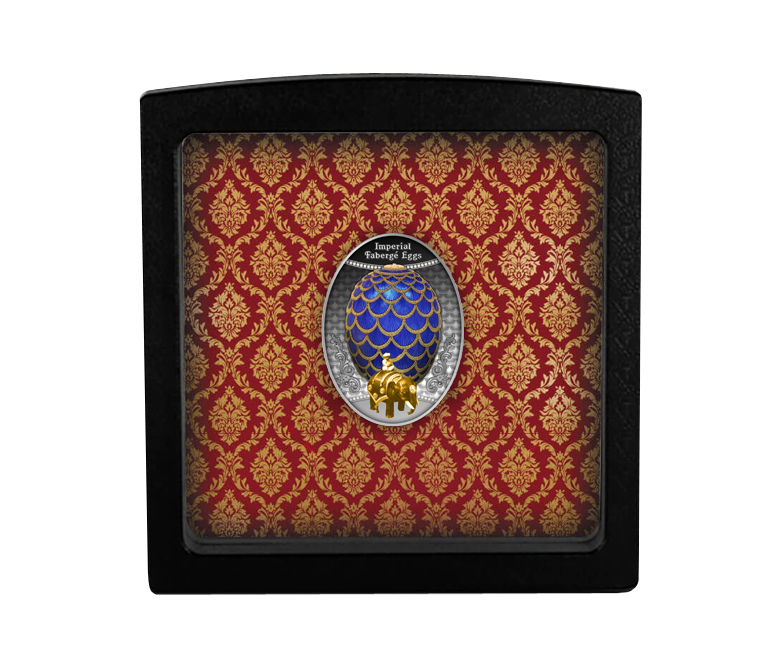The pinecone-shaped egg was made in 1900 by Alexander Kelch for his wife Barbara. It is made of gold, silver, rosette cut diamonds, brilliants, and royal blue semi-transparent enamel. The egg contains a surprise – an Indian elephant. Thanks to the coin by the Mint of Poland, you can have a precious, miniature masterpiece in your collection.