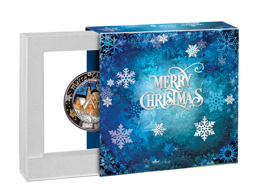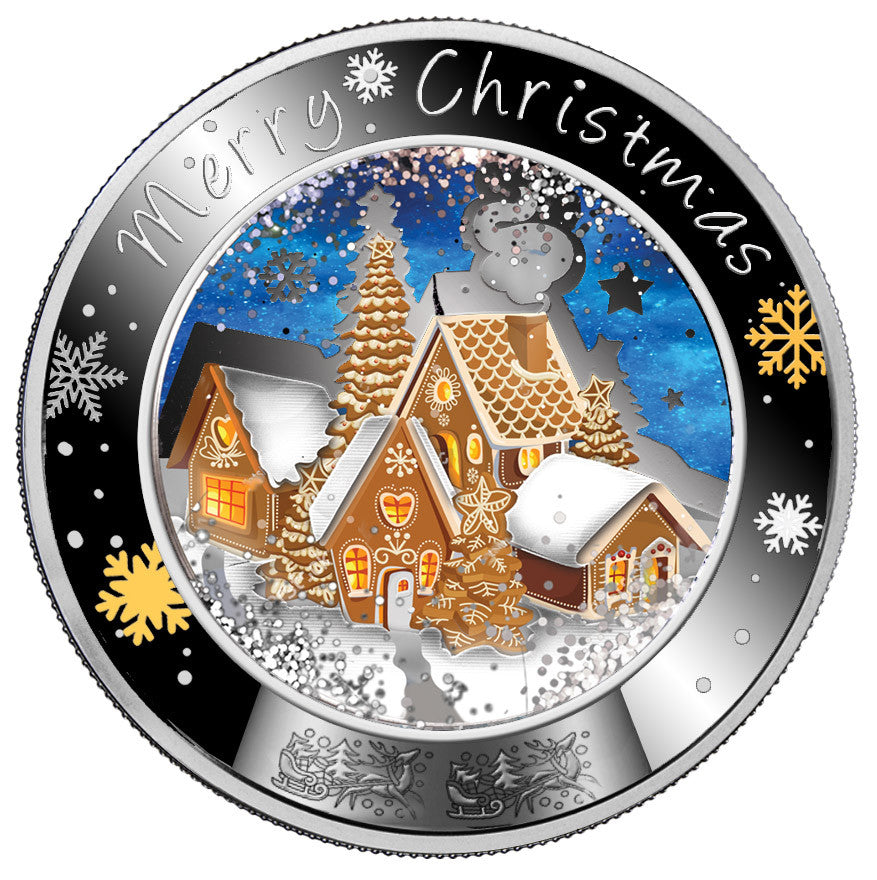 By moving the coin, you get the impression that it is snowing around the gingerbread town! The intricate combination of the highest-quality silver and hand-made finish makes each coin unique.