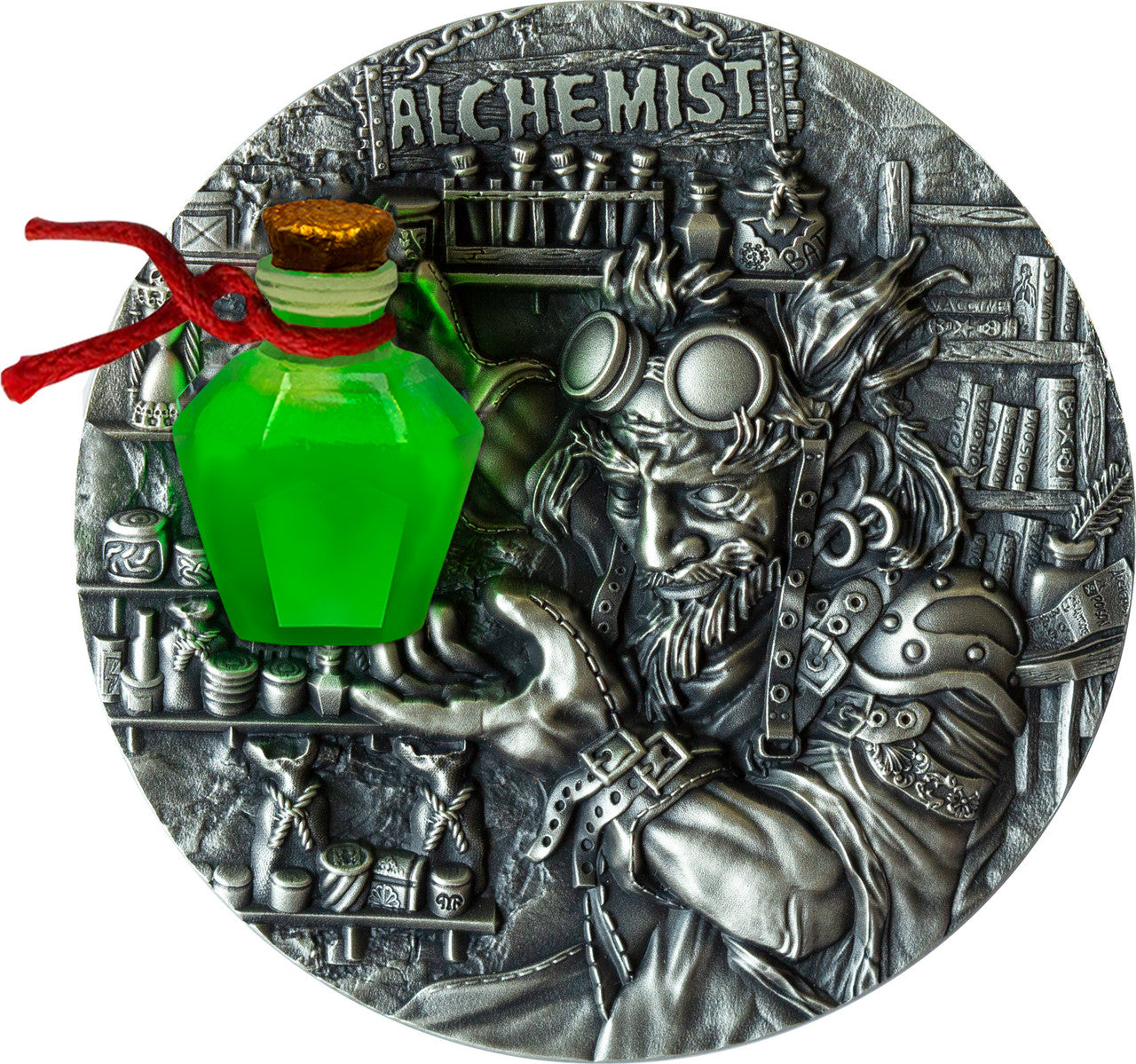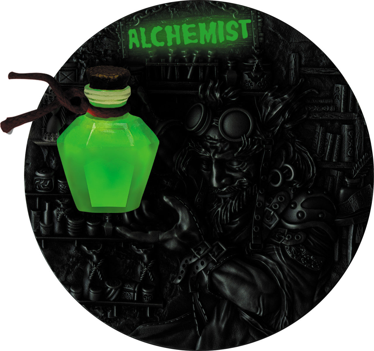 The “Alchemist” breaks traditional patterns of mint art. The combination of computer games design and ancient sciences makes it a novelty on the numismatic market.