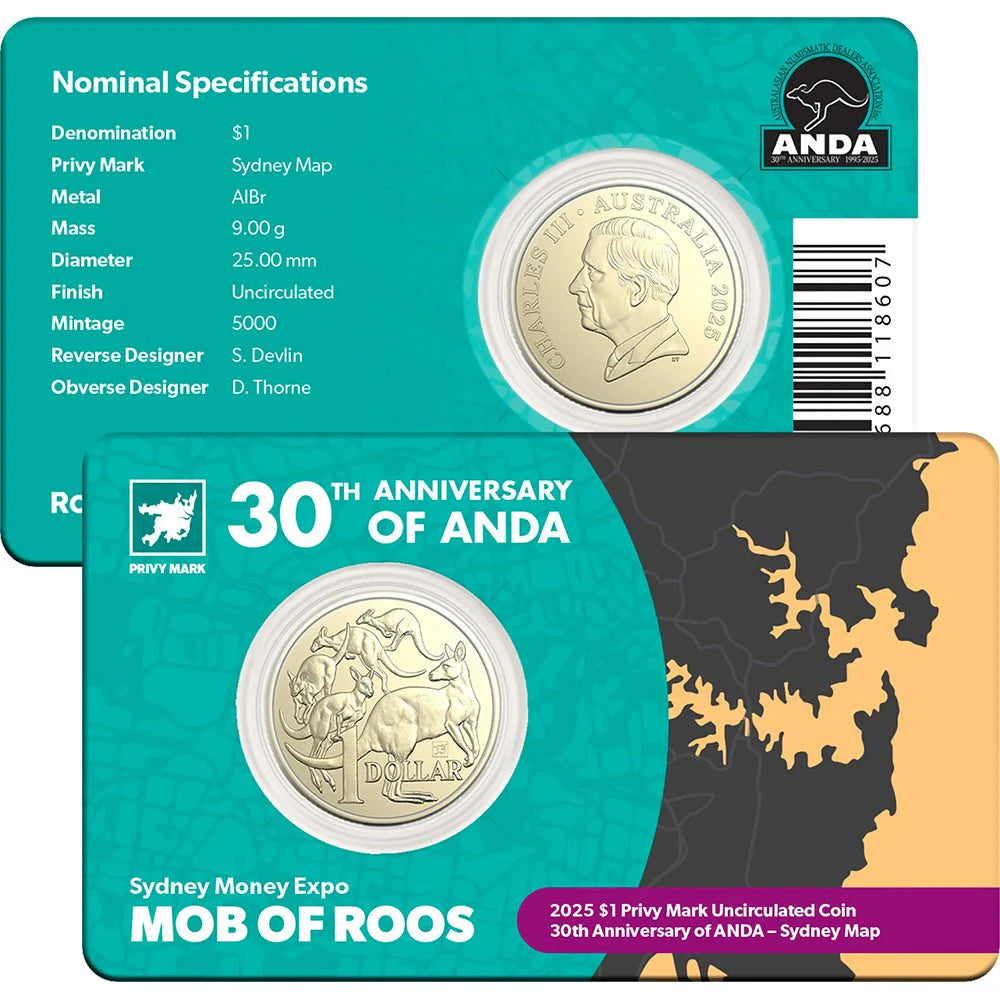 Royal Australian Mint 2025 $1 30th Anniversary of ANDA Sydney Money Expo Mob of Roos Coin in Card