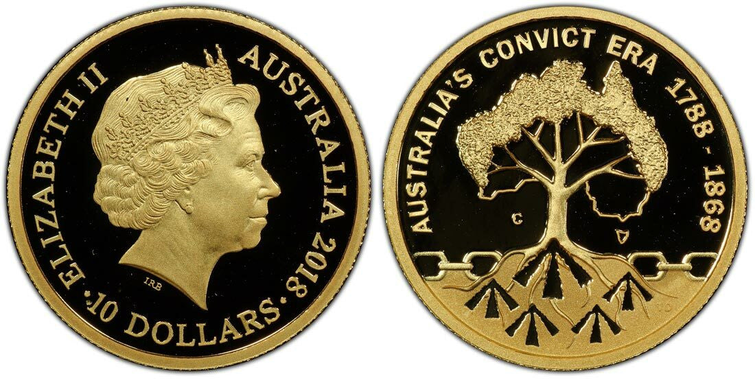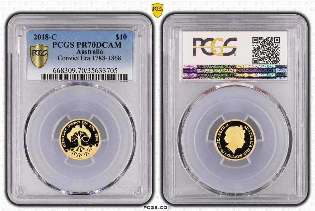The 2018-C Gold Proof $10 Convict Era 1788-1868 PR70DCAM is a flawless, highly collectible Australian coin with a limited mintage of 1,500 units.
