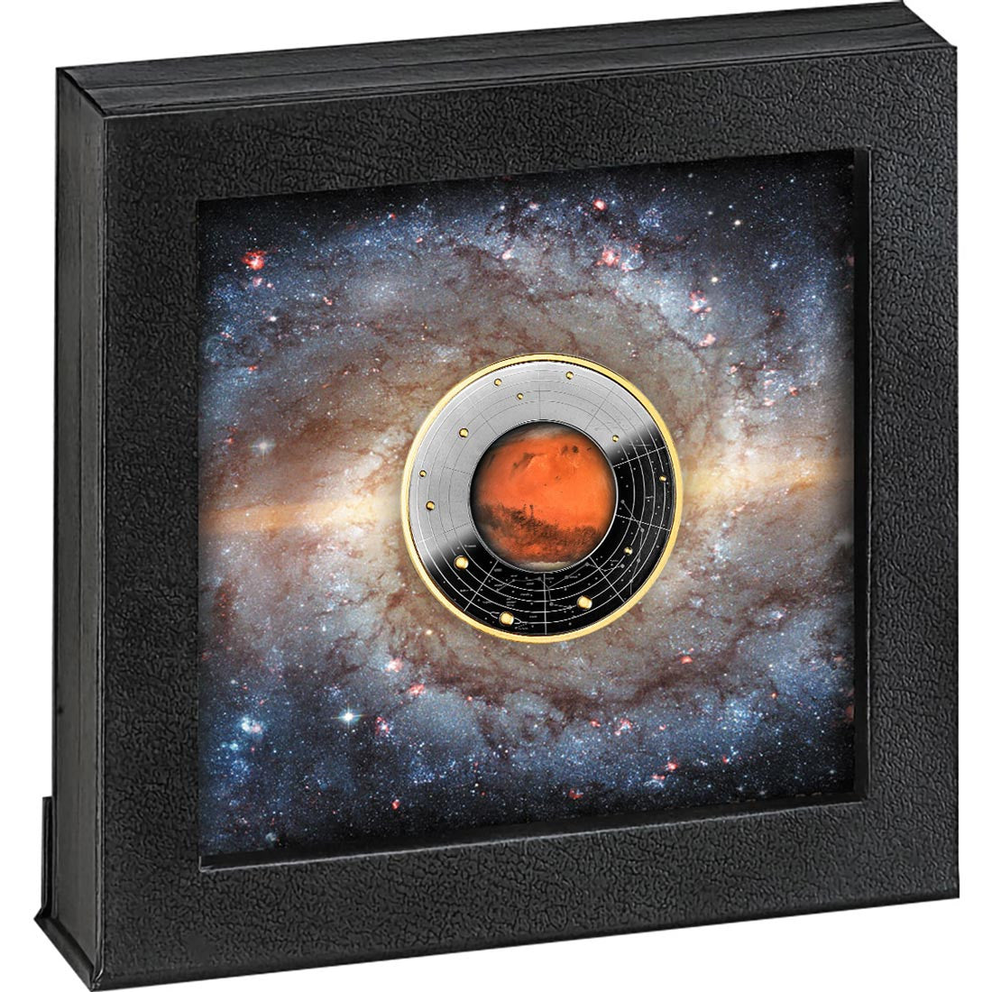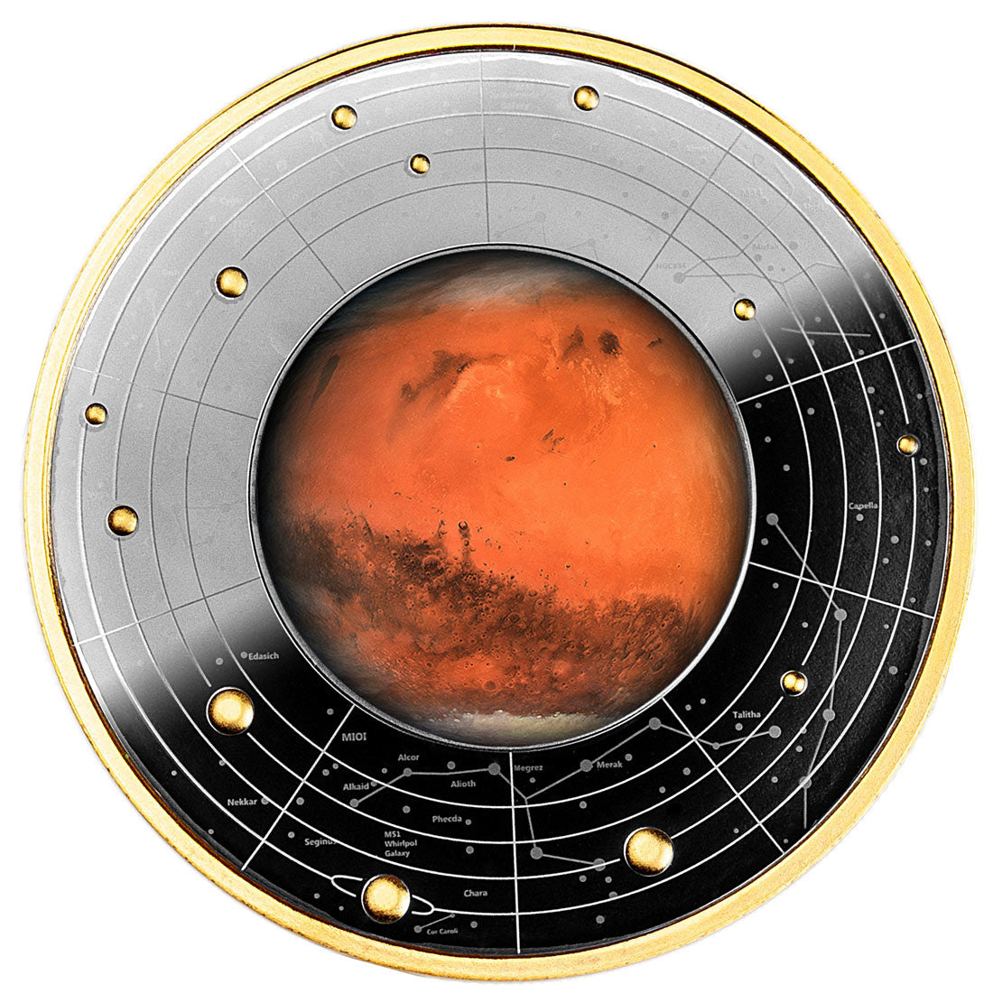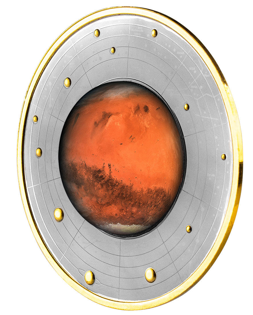 Man has been intrigued by Mars since antiquity. Known as the Red Planet, it owes its name to the Roman god of war. Yet to be unexplored, its potential is one of the greatest challenges of the modern scientific world. The silver coin with an exceptionally realistic image of the planet enclosed under the lens will surely please every astronomy lover.