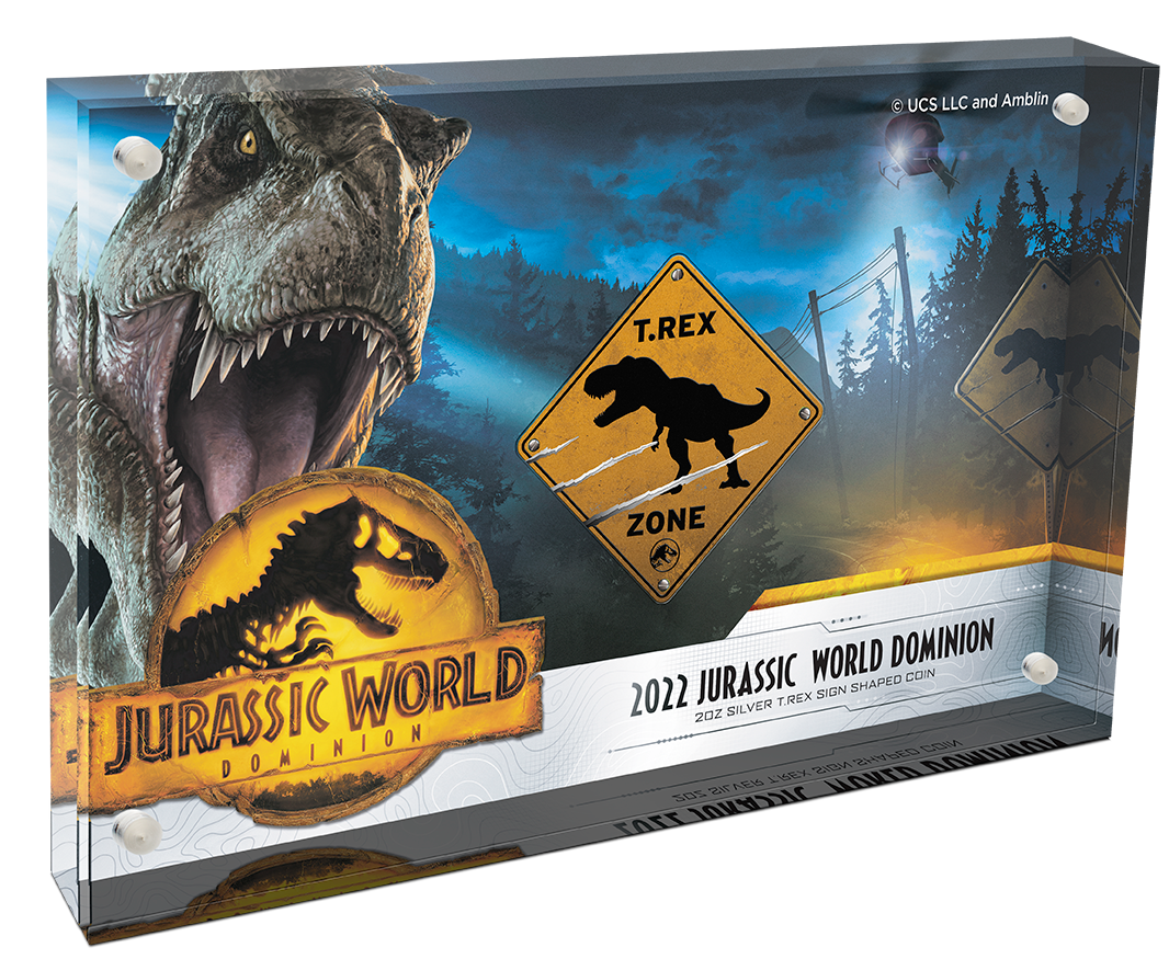 To celebrate the upcoming release of the Jurassic World Dominion film, The Coin Company is excited to present the 2022 Jurassic World 2oz Silver T.Rex Zone Sign Shaped Coin.