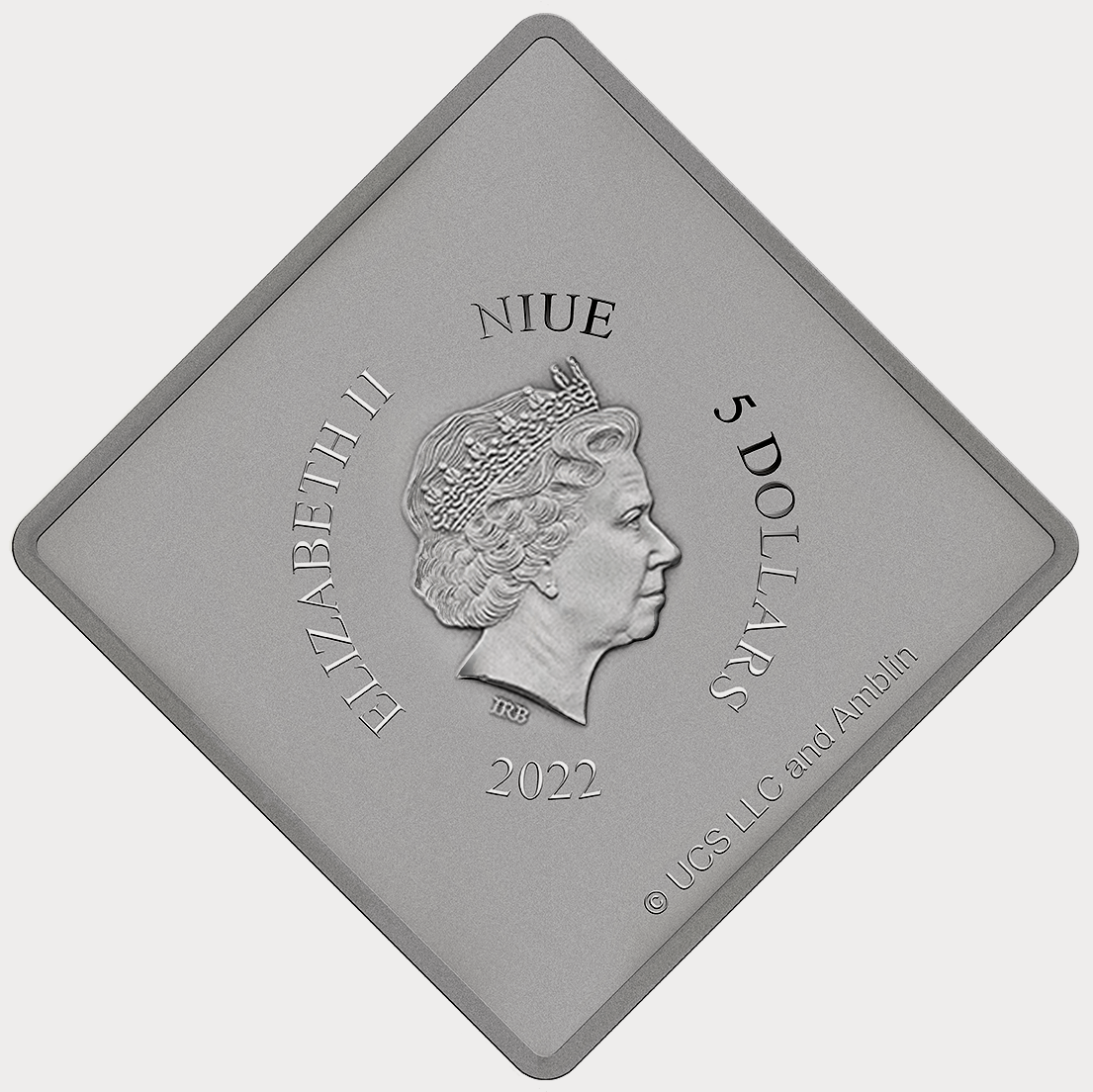 This coin is struck in a unique shape to replicate a detailed replica of the “T.Rex Zone” road sign damaged by the T.Rex claw, featured in the Jurassic World films. The coin’s surface has been ‘antiqued’ by hand to give it a unique finish.
