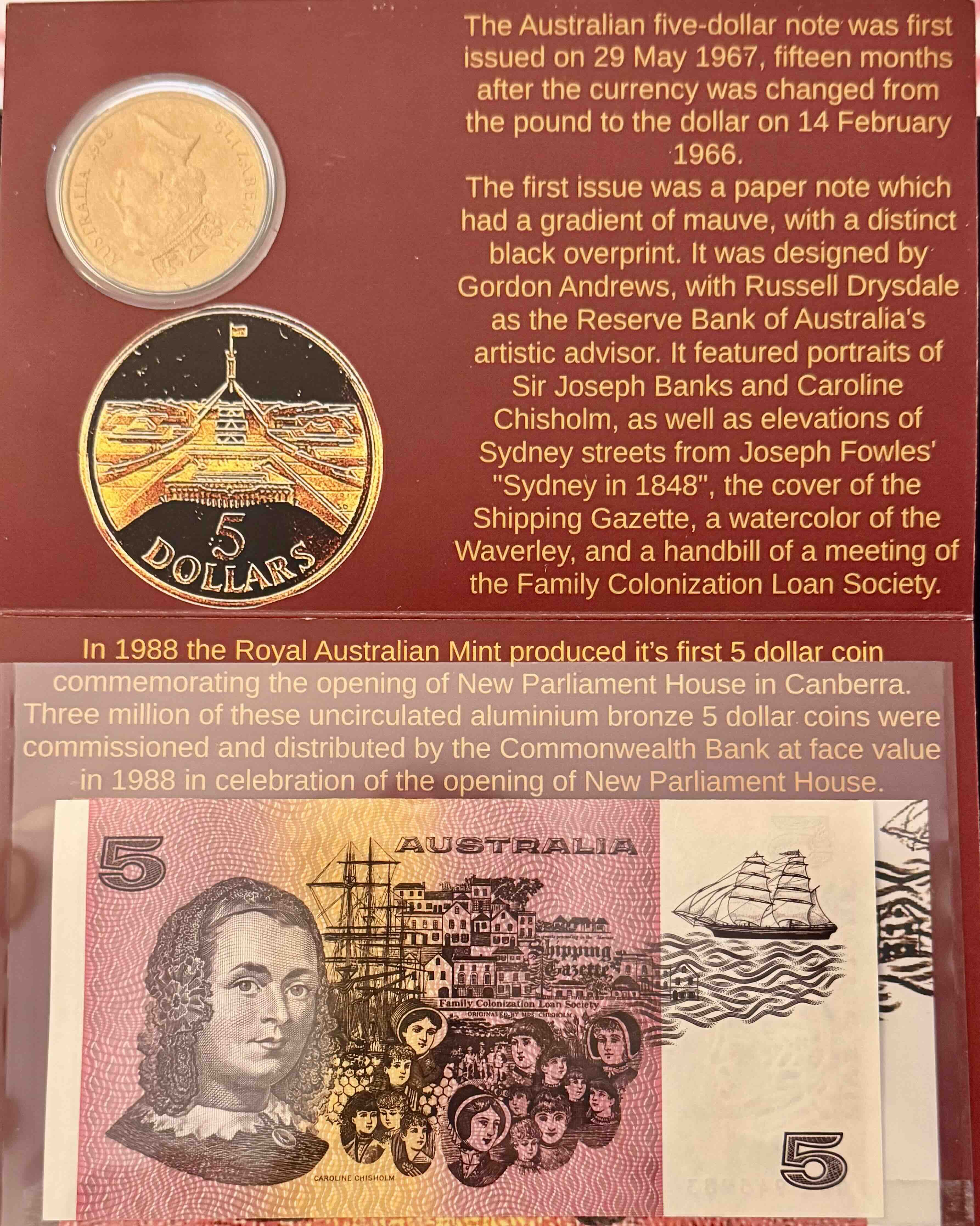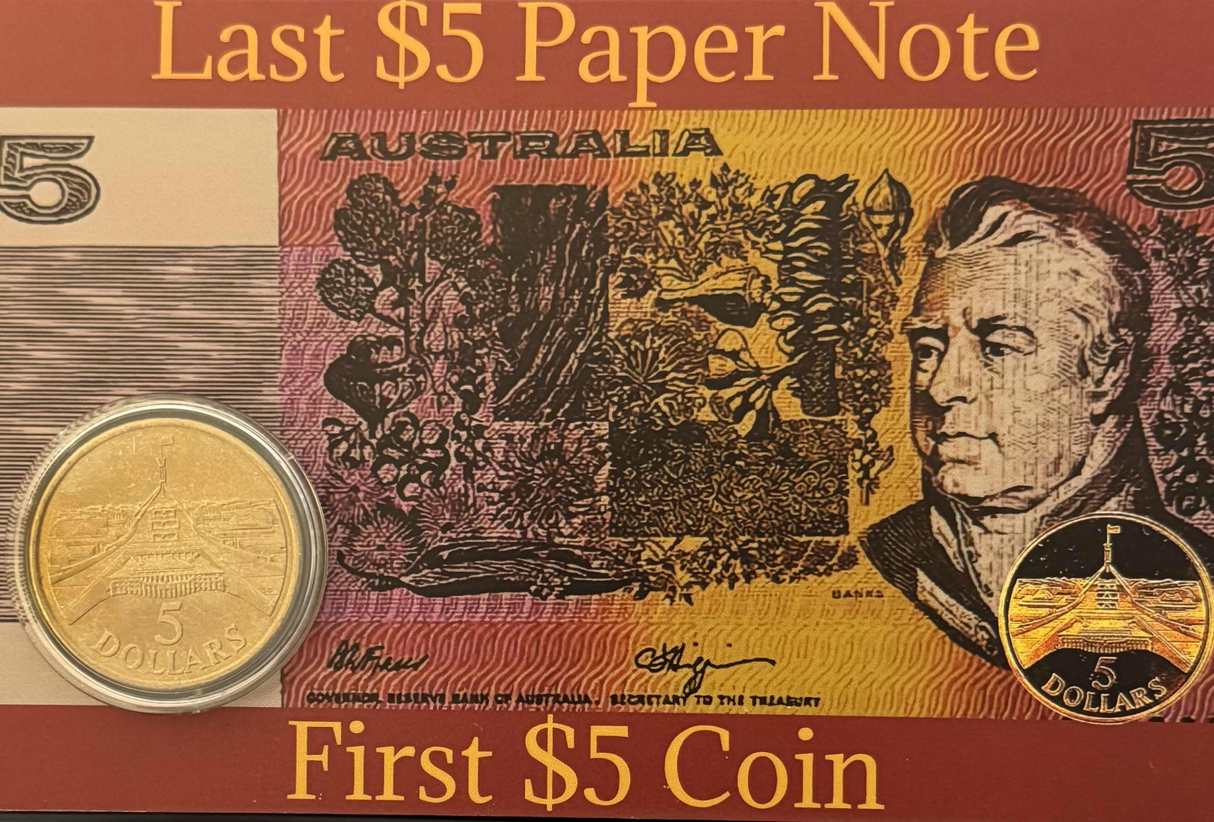 Australian Last $5 Dollar Note and First $5 Coin UNC Set