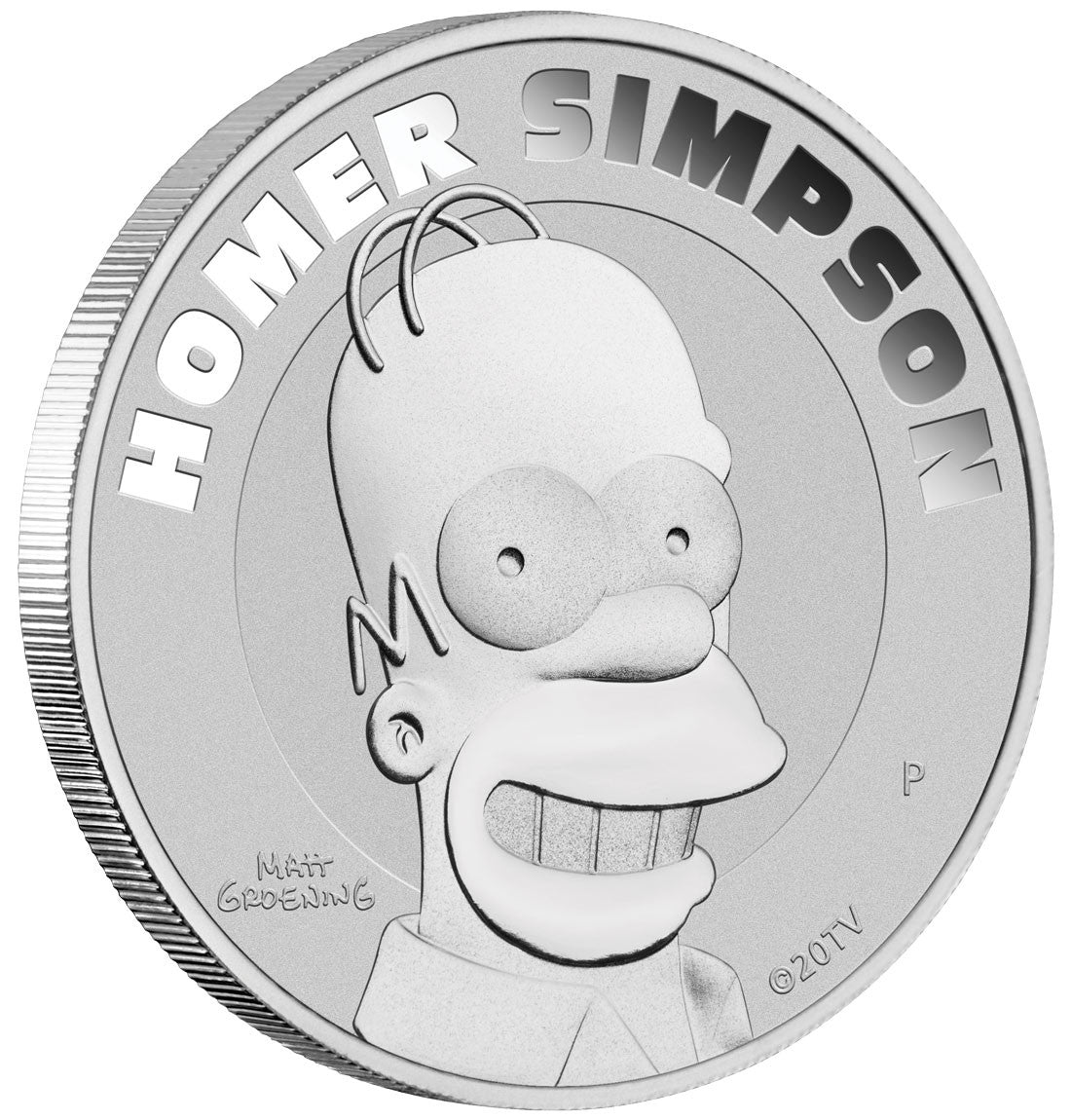 The reverse of the coin depicts Homer Simpson beneath an incused inscription of his name. The design also includes Matt Groening’s signature and The Perth Mint’s ‘P’ mintmark.