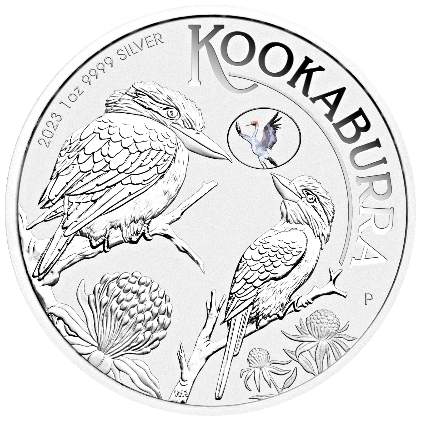 The coin’s reverse portrays a coloured representation of two kookaburras perched on the branches of a shrub displaying the flowers of Australian native waratah. Included in the design is the inscription ‘KOOKABURRA’, The Perth Mint’s ‘P’ mintmark, and the coin’s purity and 2023 year-date.