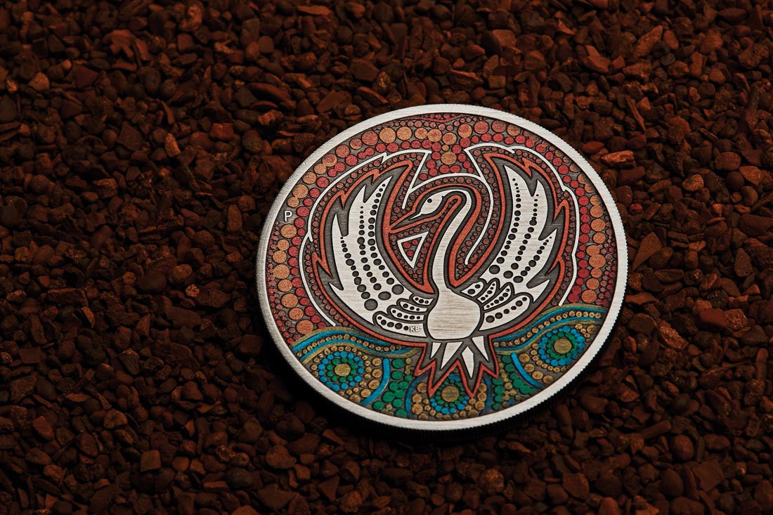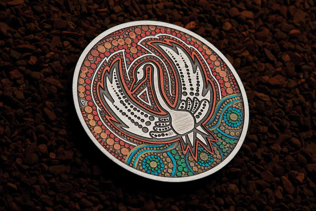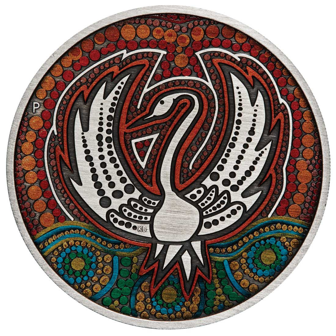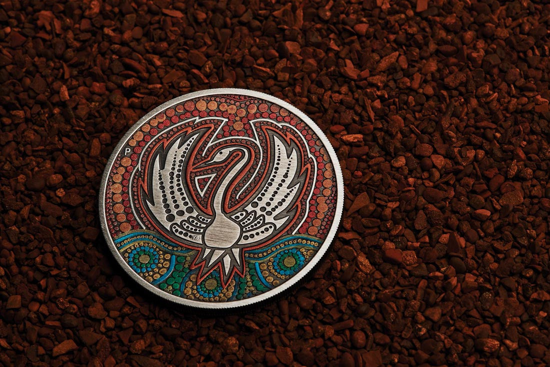 This first of its kind 2oz silver antiqued coloured coin features an original coloured painting of a black swan by Kevin Bynder, a proud Whadjuk-Yuet-Ballardong man.