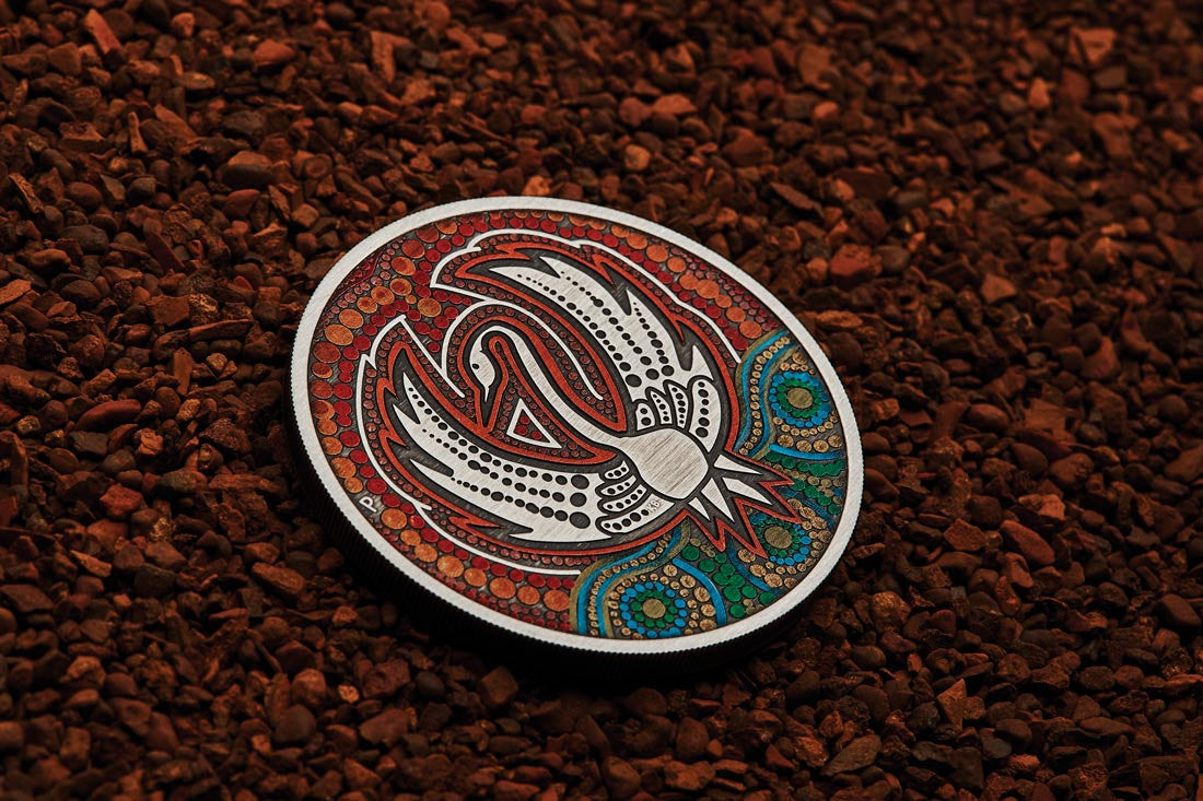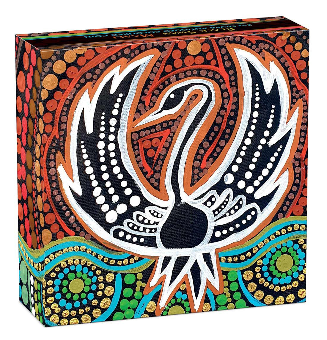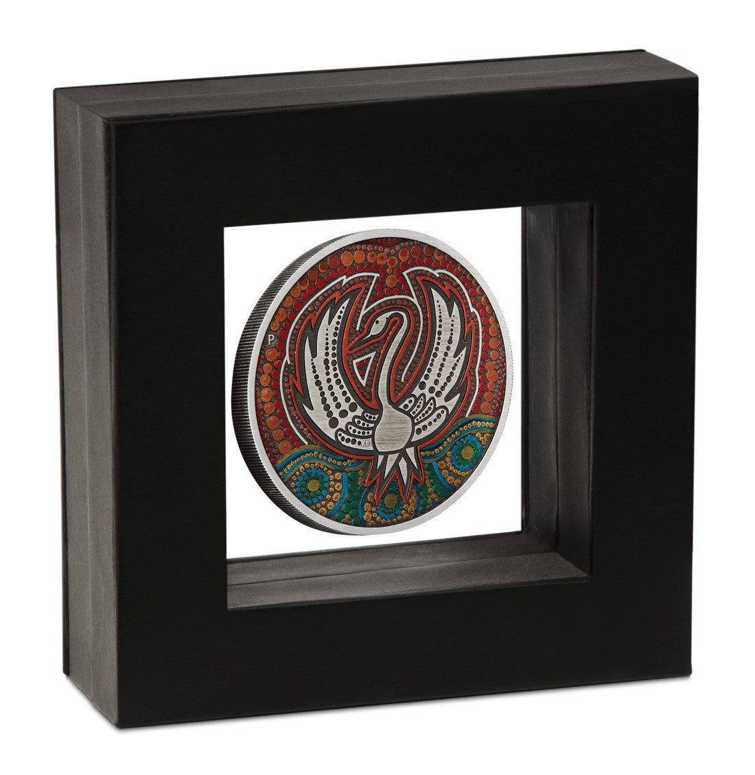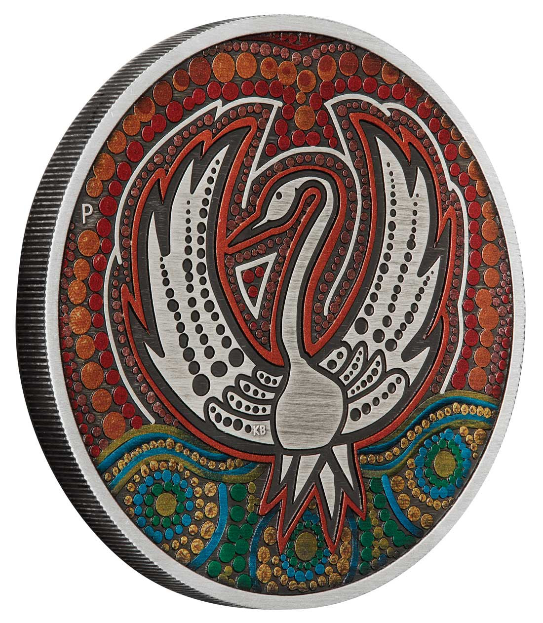 This first of its kind 2oz silver antiqued coloured coin features an original coloured painting of a black swan by Kevin Bynder, a proud Whadjuk-Yuet-Ballardong man.