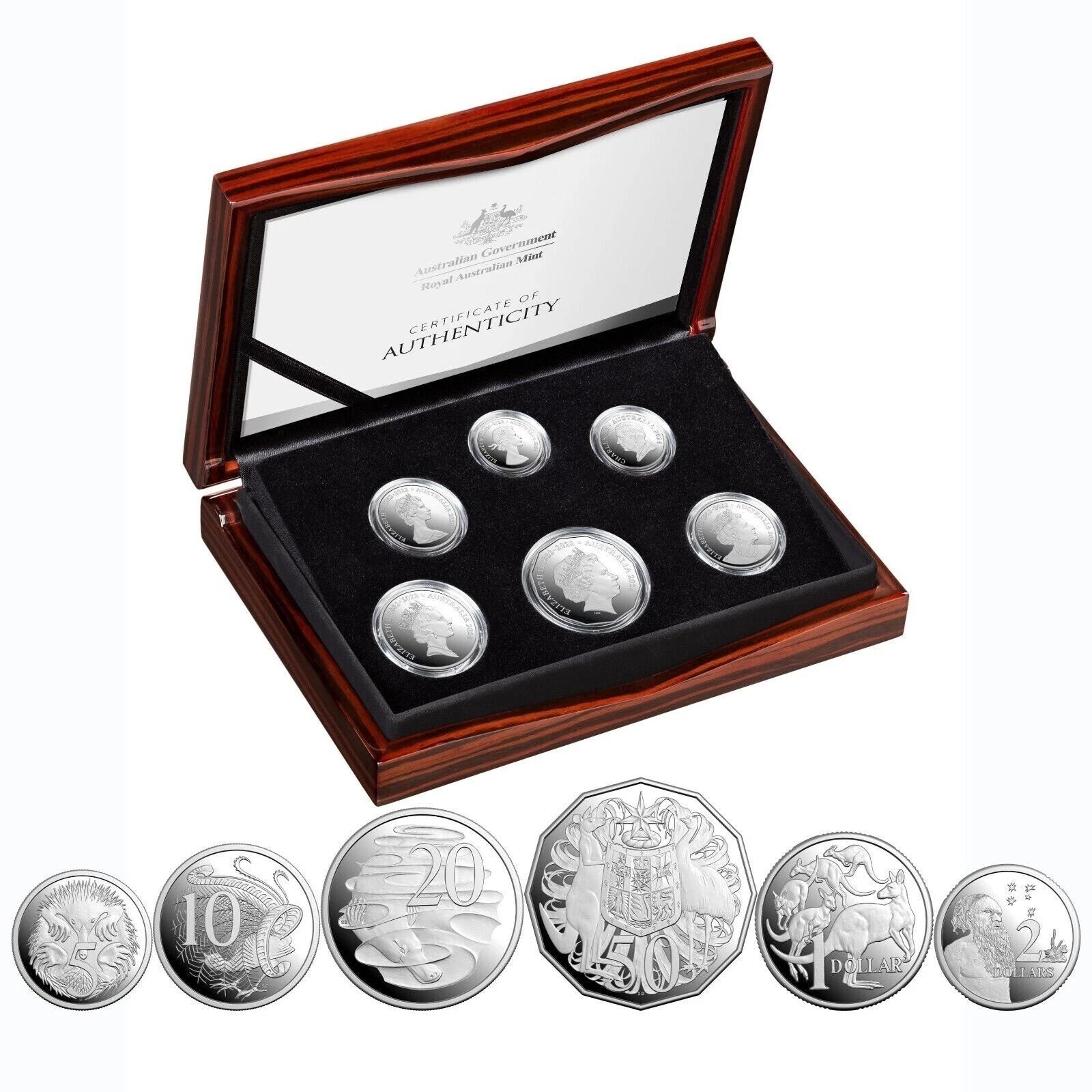 The Royal Australian Mint's 2024 Silver Proof Year Set is the benchmark in numismatic quality and attention to detail. This stunning set of six fine silver coins features Australia's iconic circulating designs, and past and present Royal effigies on the obverses of each coin