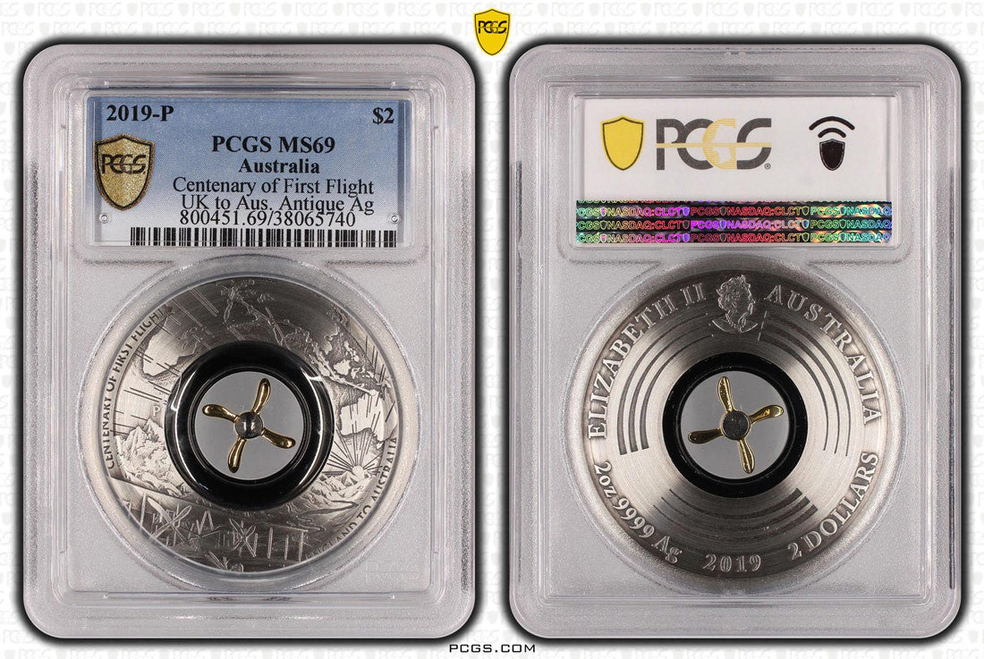 2019-P $2 Centenary of First Flight UK to Aus. Antique 2oz Silver PCGS MS69
