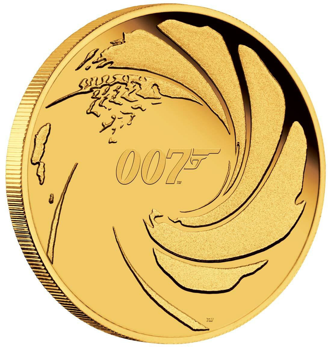 The coin’s reverse portrays the iconic Bond 007 gun logo at the centre of a gun barrel.