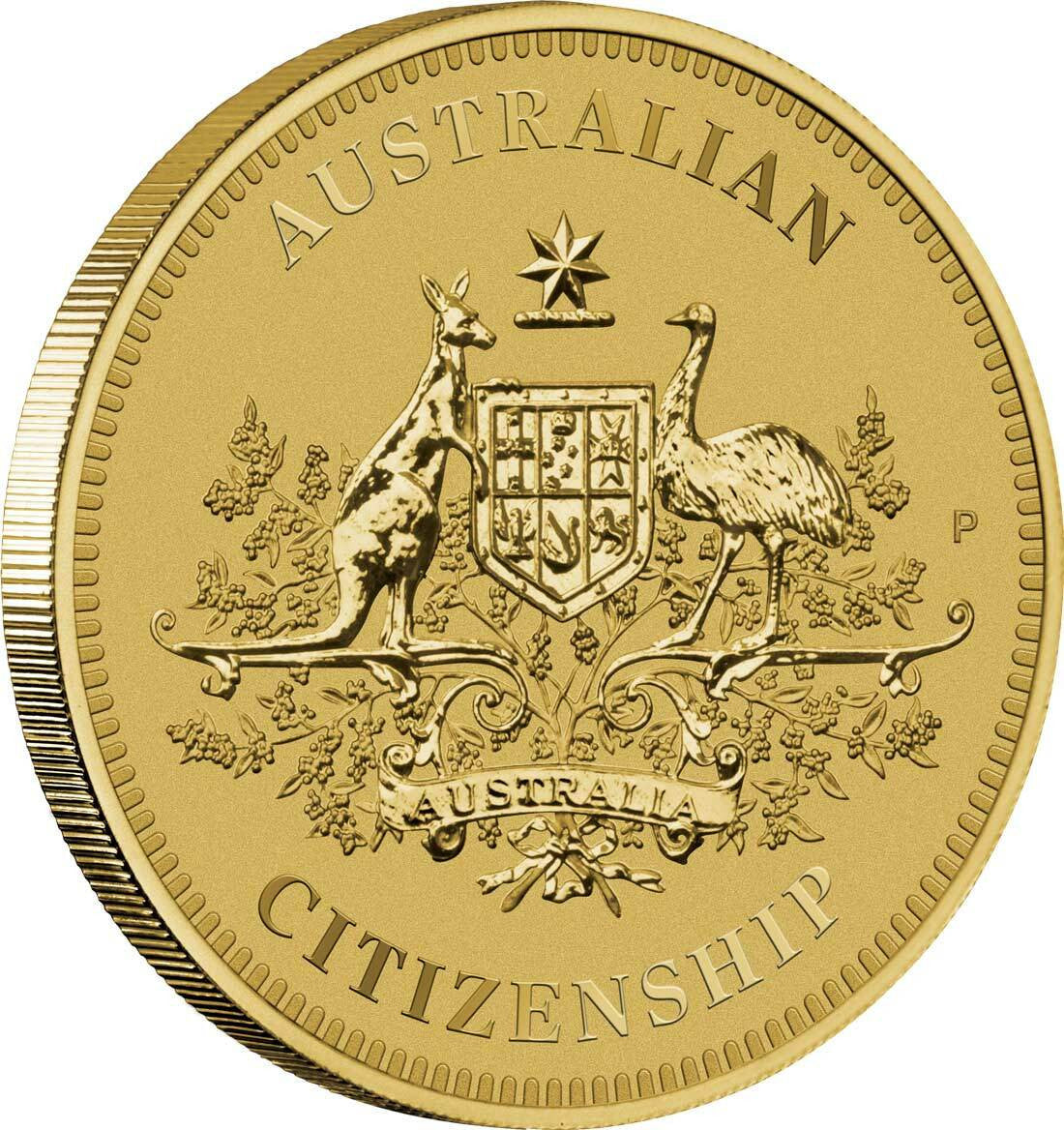 The coin’s reverse design depicts the Australian Commonwealth Coat of Arms, accompanied by the words AUSTRALIAN and CITIZENSHIP. The Coat of Arms consists of the badges of the six States of the Commonwealth on a shield enclosed by an ermine border signifying Australian Federation in 1901. The design also incorporates The Perth Mint’s traditional ‘P’ mintmark.
