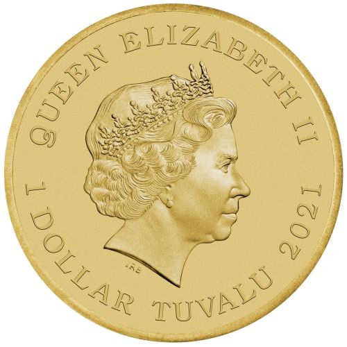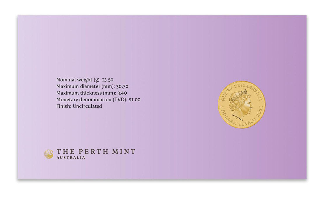Issued as Tuvalu legal tender, the uncirculated aluminium bronze coin is housed in a beautifully designed card with a circular window revealing the coin’s reverse and obverse designs.