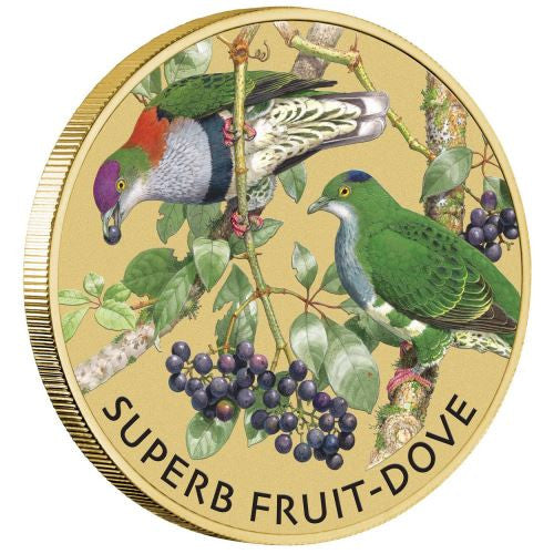 The coin's reverse design depicts two coloured Superb Fruit-doves perched on a tree. The design also includes the inscription ‘SUPERB FRUIT-DOVE’.
