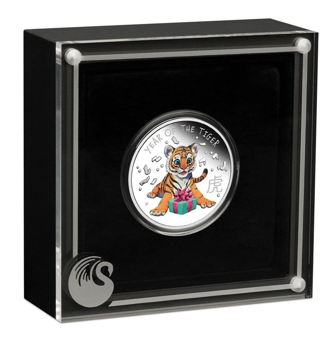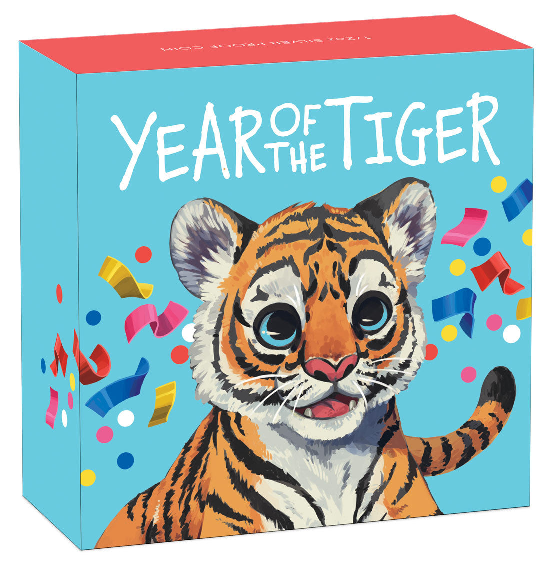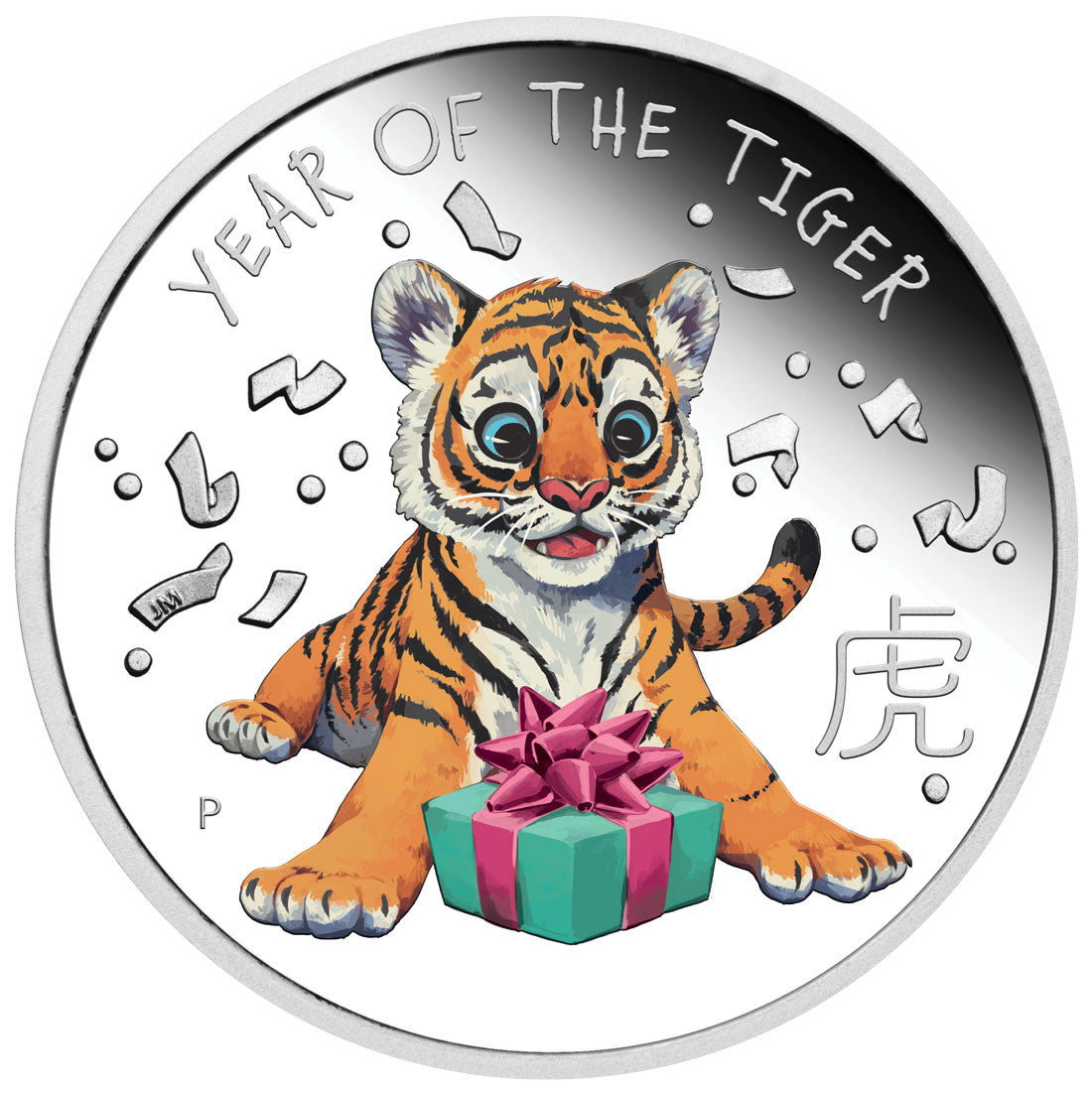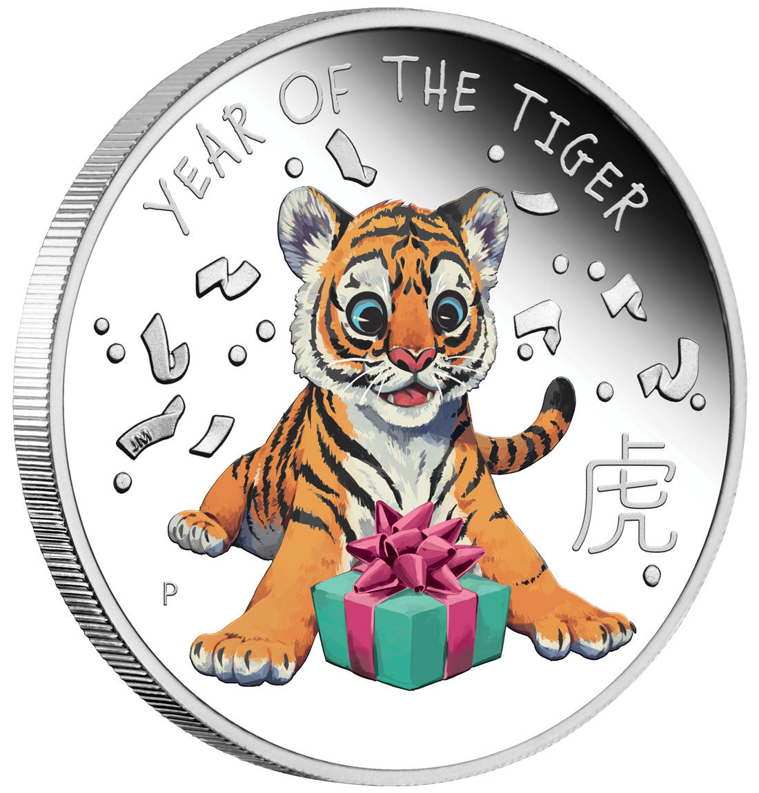The coin’s reverse depicts a coloured representation of a cute tiger cub embracing a gift-wrapped parcel with representations of party confetti in the background. The Chinese character for ‘tiger’, the inscription ‘YEAR OF THE TIGER’ and The Perth Mint’s ‘P’ mintmark are also incorporated into the design.