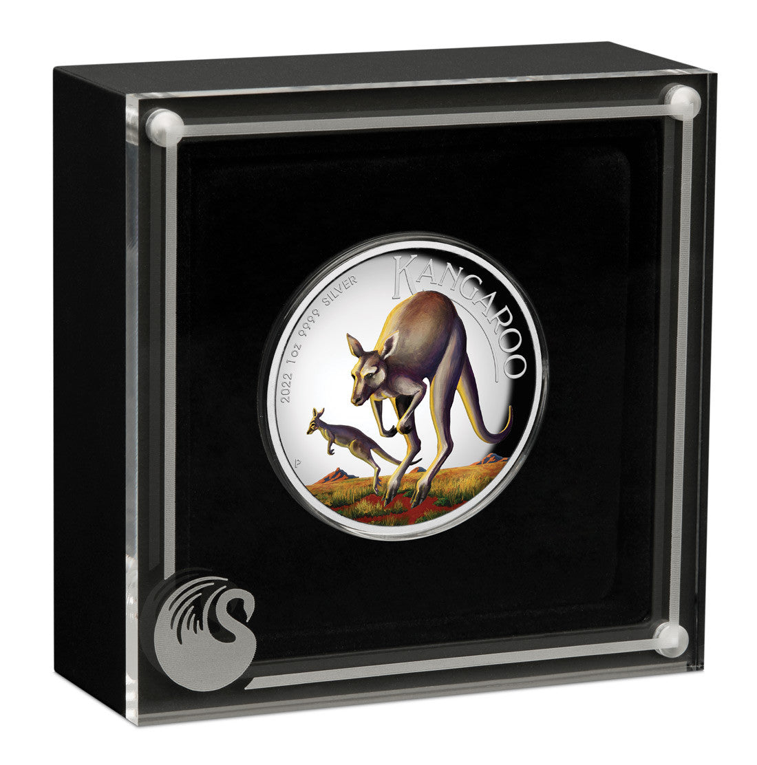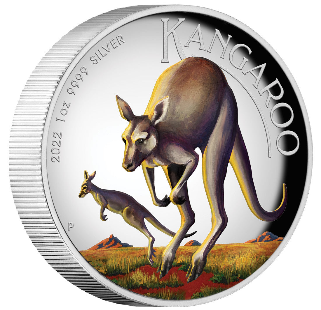 The reverse of the coin portrays a bounding kangaroo and its joey in colour. Other coloured elements in the design comprise a grassy plain with red soils and hillocks on the horizon. As well as the inscription ‘KANGAROO’ and The Perth Mint’s ‘P’ mintmark, the reverse also incorporates the coin’s weight, purity and 2022 year-date.