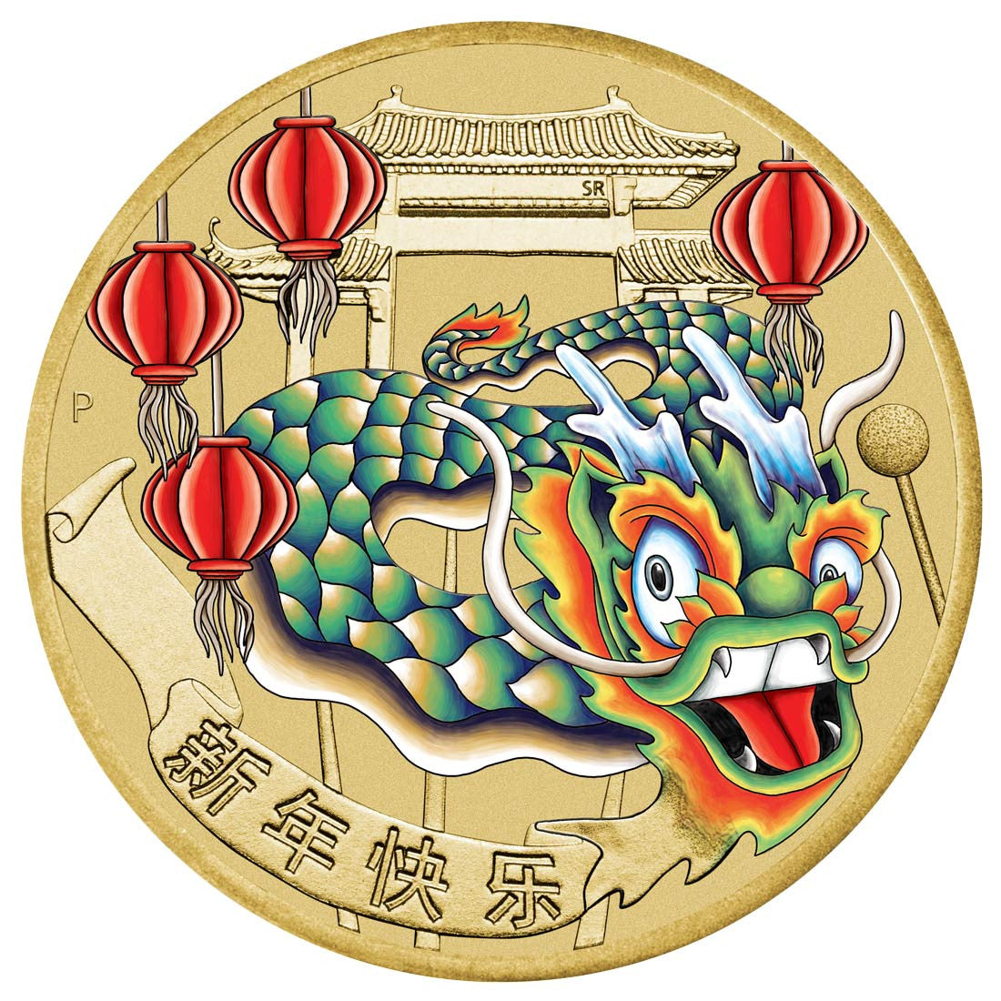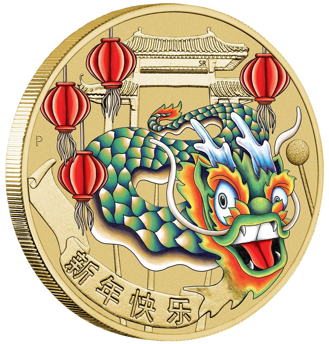 The reverse of the coin depicts a Chinese dragon and lanterns in vivid colour. Also included in the design are the Chinese characters for ‘Happy New Year’ and The Perth Mint’s traditional ‘P’ mintmark.
