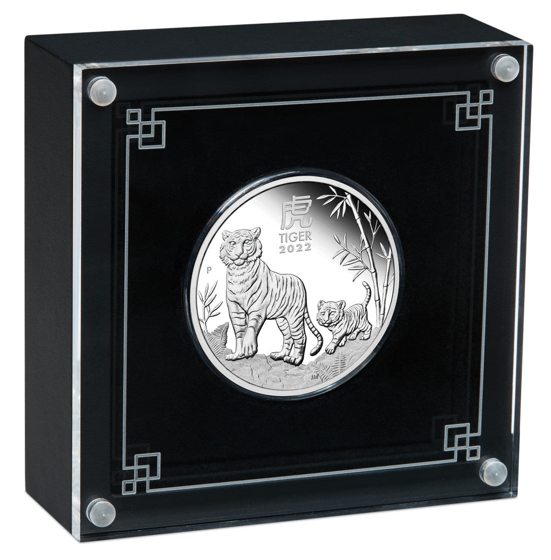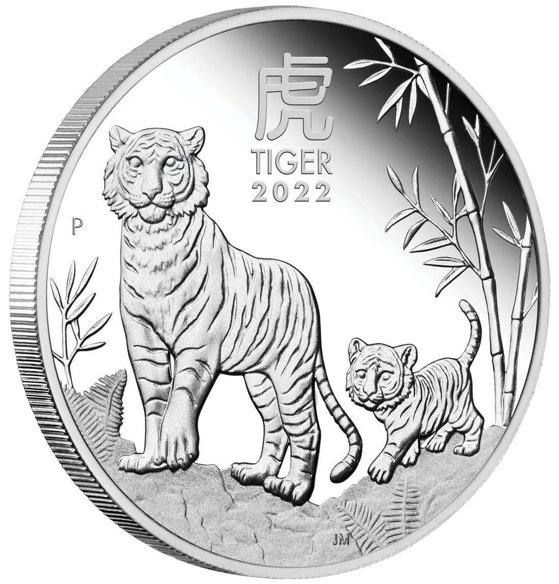 The coin’s reverse of each coin portrays a tiger cub following its proud and protective parent across a rocky terrain featuring ferns and bamboo. Included in the design is the Chinese character for ‘tiger’, the inscription ‘TIGER 2022’ and the Perth Mint’s ‘P’ mintmark.