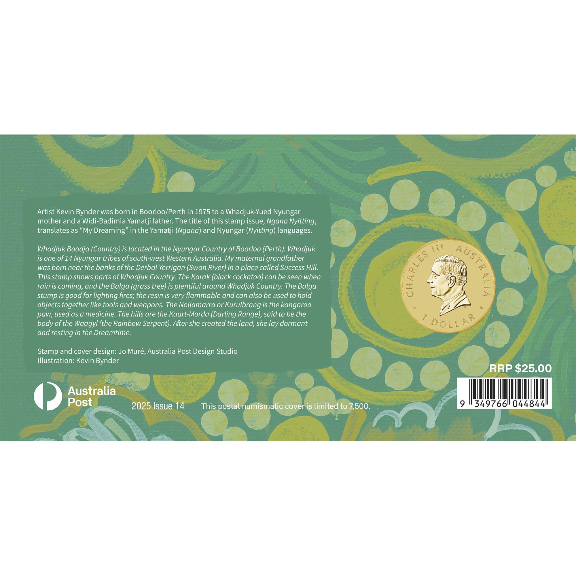 Paying tribute Whadjuk boodja, this stamp and coin cover from Australia Post features original artwork by Whadjuk-Yuet-Ballardong artist Kevin Bynder.