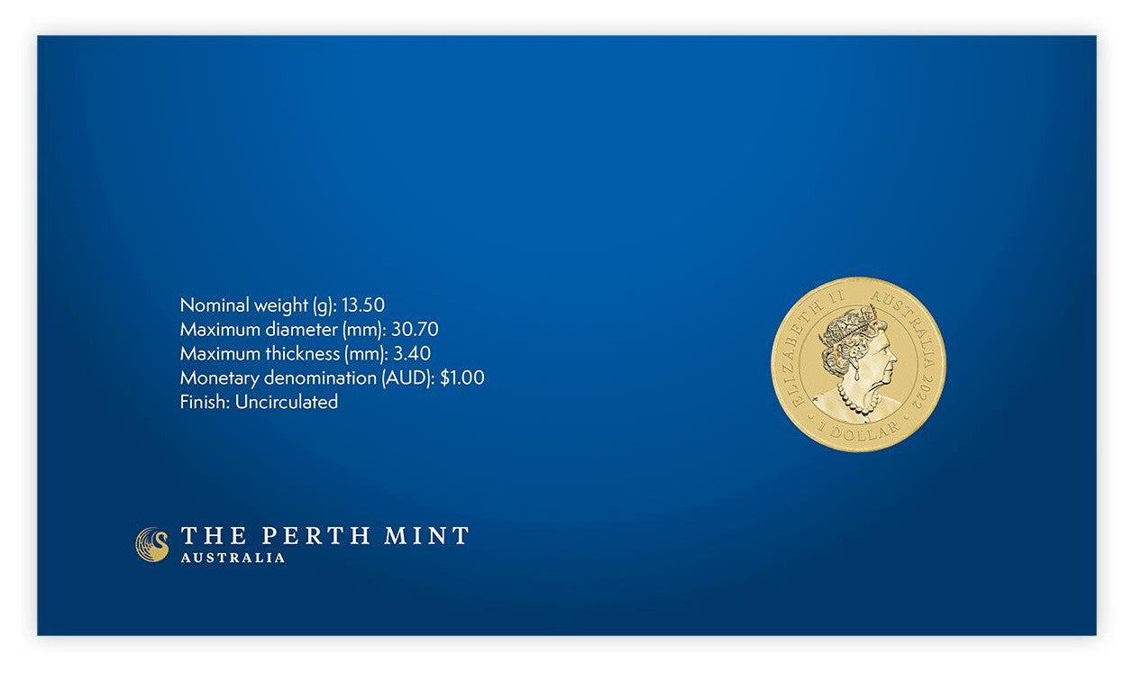 Issued as Australian legal tender, the uncirculated aluminium bronze coin is housed in a beautifully designed card with a circular window revealing the coin’s reverse and obverse designs.