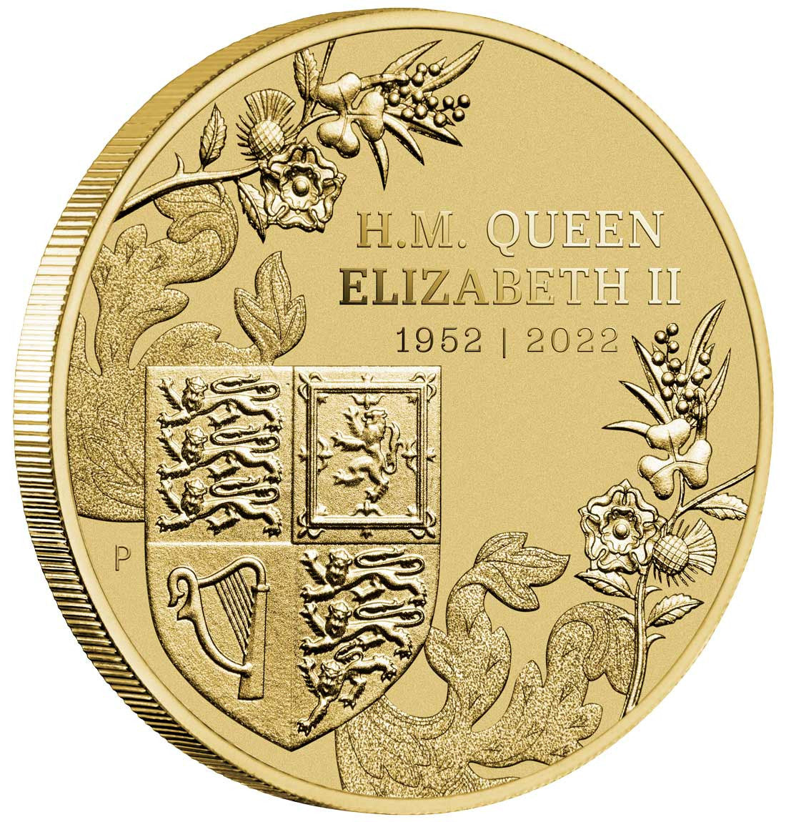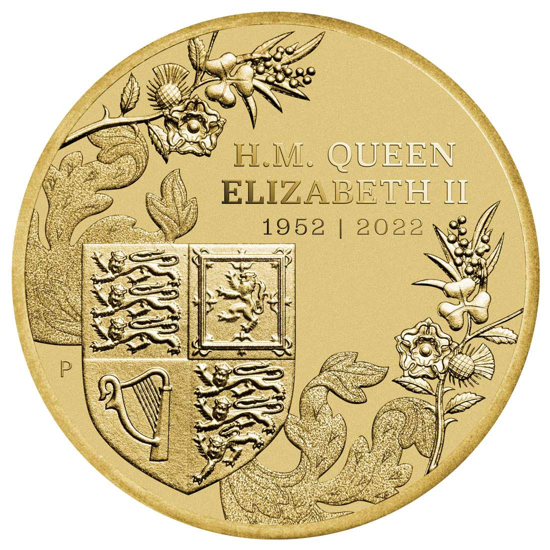 Each coin’s reverse portrays the Shield of the Royal Coat of Arms featuring three lions passant, a harp, and a lion rampant – ancient heraldic symbols of England, Ireland and Scotland. A figurative flower stem combines stylised representations of an English rose, Irish shamrock and Scottish thistle, together with Australian wattle. Also included in the design is the inscription ‘H.M. QUEEN ELIZABETH II 1952 | 2022’, The Perth Mint’s ‘P’ mintmark, and an artistic interpretation of the mantle from the Royal Arms – originally a linen cover on the back of a medieval knights helmet.