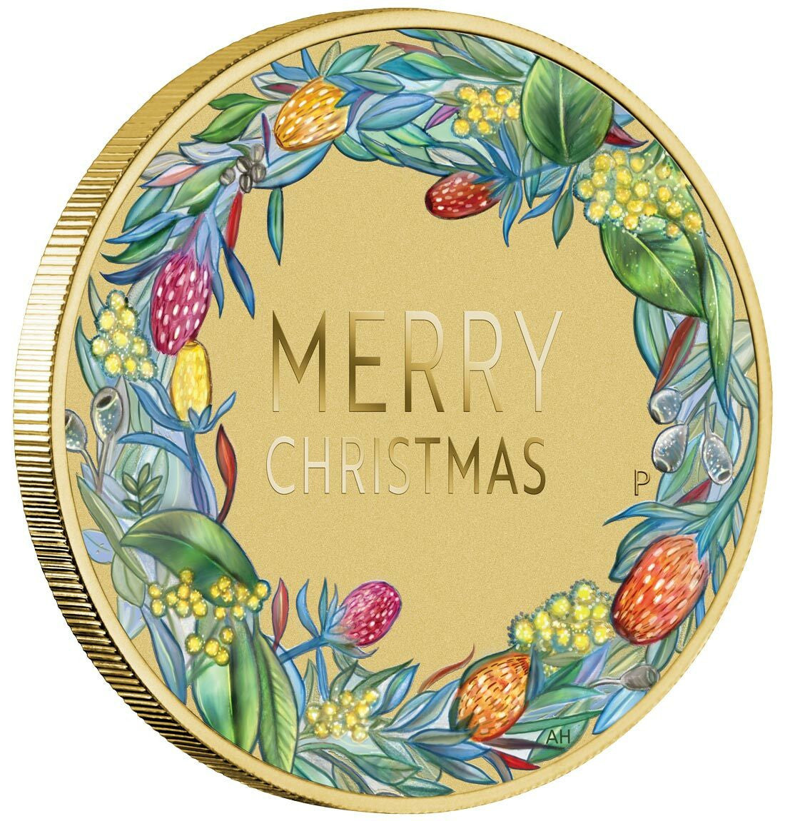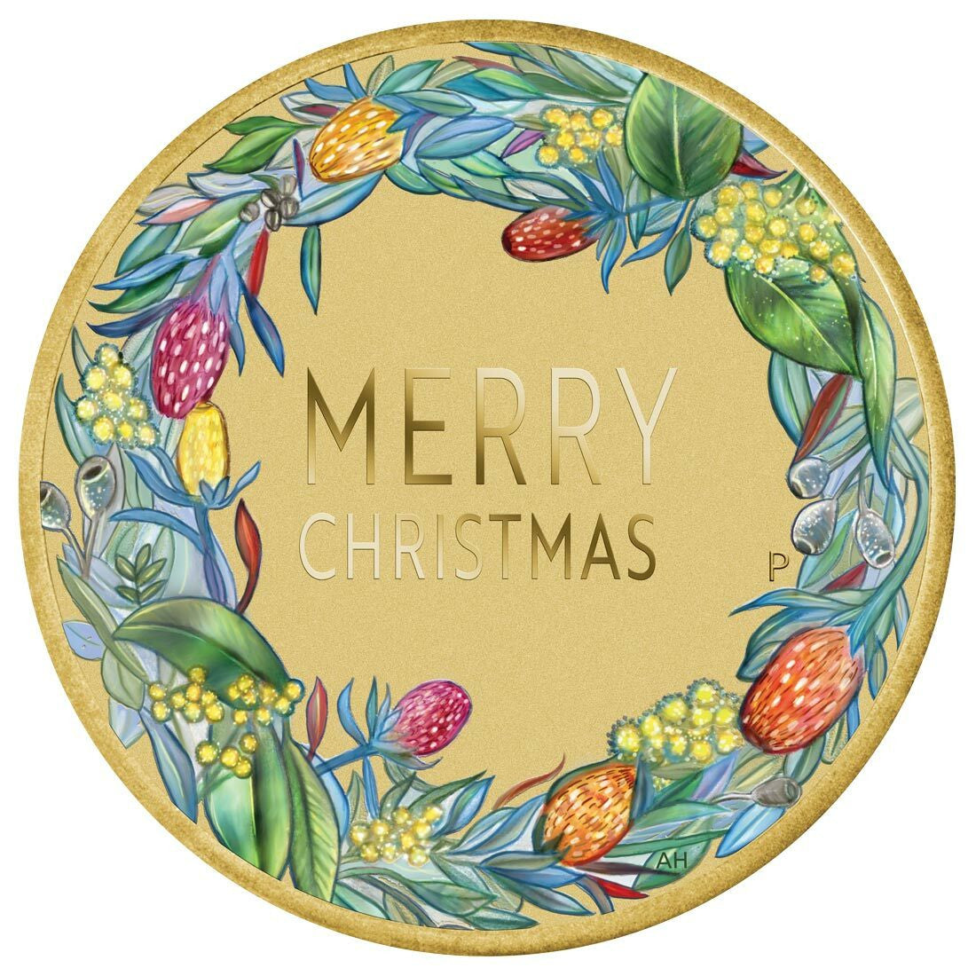 The stamp and coin cover incorporates an Australian coin featuring the inscription MERRY CHRISTMAS. It is surrounded by a colourful garland of native flowers in a design that also includes The Perth Mint’s official ‘P’ mintmark.