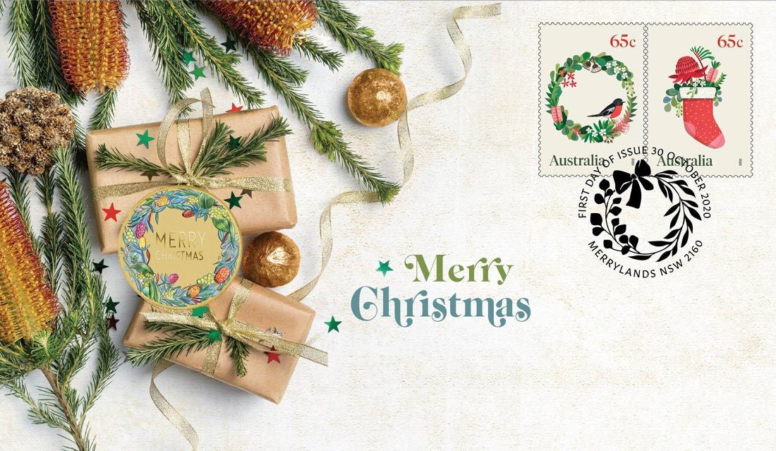The stamp and coin cover features an illustrated envelope featuring Banksia ‘candles’ amid fir tree branches, decorative baubles and gift-wrapped boxes to evoke the sense of an Australian Christmas. It includes two Australian 65-cent stamps portraying Christmas motifs and a special postal stamp marked MERRYLANDS NSW 2160.