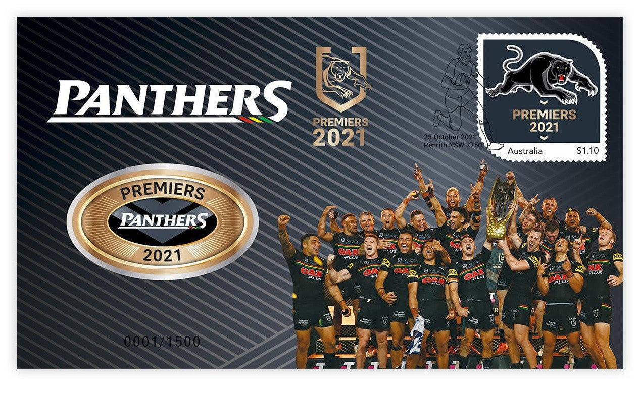Australia Post is celebrating the Penrith Panthers' gripping win in the NRL Telstra Premiership Grand Final, with a 2021 NRL Premiers stamp and medallion cover.
