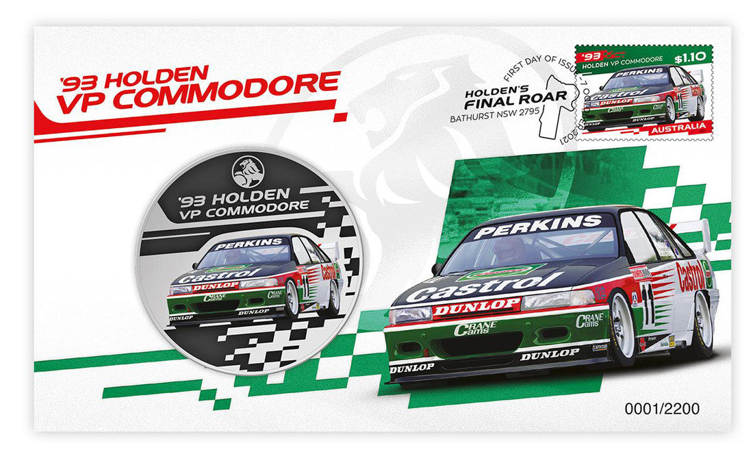 This limited stamp and medallion cover features a pictorial envelope with the $1.10 1993 VP Commodore stamp from the Holden's Final Roar stamp issue and related medallion. The stamp is postmarked - First day of issue | 7 October 2021 | Bathurst NSW 2795