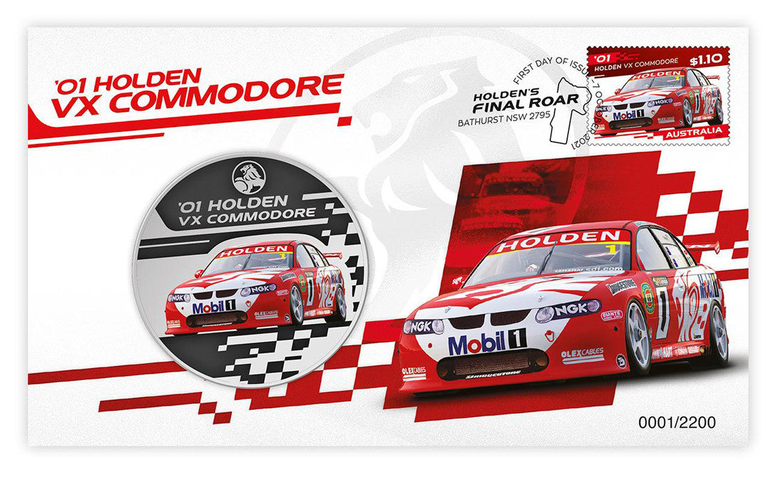 This limited stamp and medallion cover features a pictorial envelope with the $1.10 2001 VX Commodore stamp from the Holden's Final Roar stamp issue and related medallion. The stamp is postmarked - First day of issue | 7 October 2021 | Bathurst NSW 2795