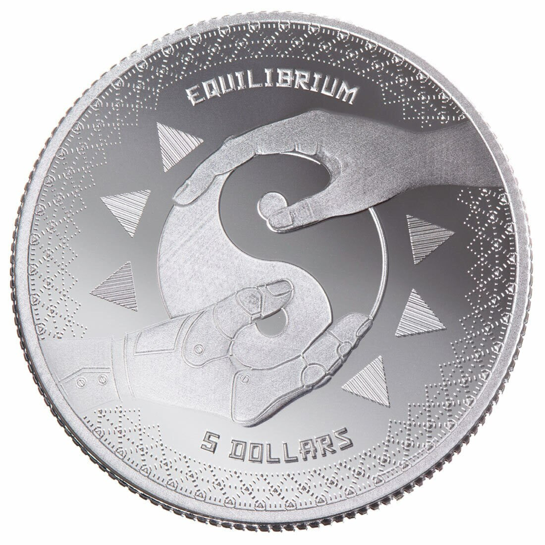 Reverse: “EQUILIBRIUM”, “5 DOLLARS”, Yin-Yang symbol, Human hand and robotic hand, textures. Divided year of issue is one of the distinguishing features of a historical Pressburg Mint
