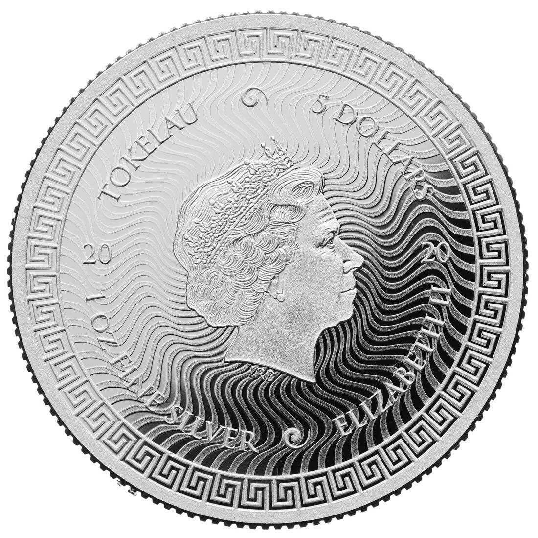 ​Obverse: “ELIZABETH II”, “TOKELAU”, “5 DOLLARS”, “1 oz Fine Silver”, Effigy of Her Majesty Queen Elizabeth II, “Divided year of Issue 2020”, Maori icon of Koru symbol, textures