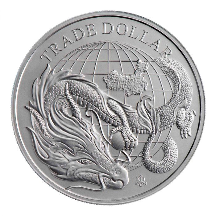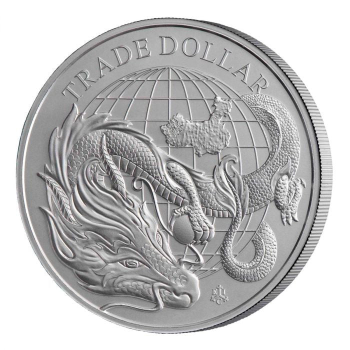 - Reverse: a striking reinterpretation of the classic Chinese Trade Dollar featuring a dragon encircling the globe along with a visual geographical representation of modern day China