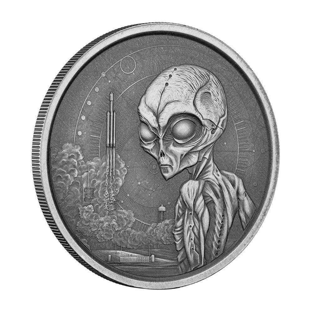 The Reverse of the coin depicts an alien in front of a rocket launching from earth and futuristic design in the background. The obverse depicts the classic effigy of Queen Elizabeth II by Ian Rank-Broadley surrounded by crop circles.