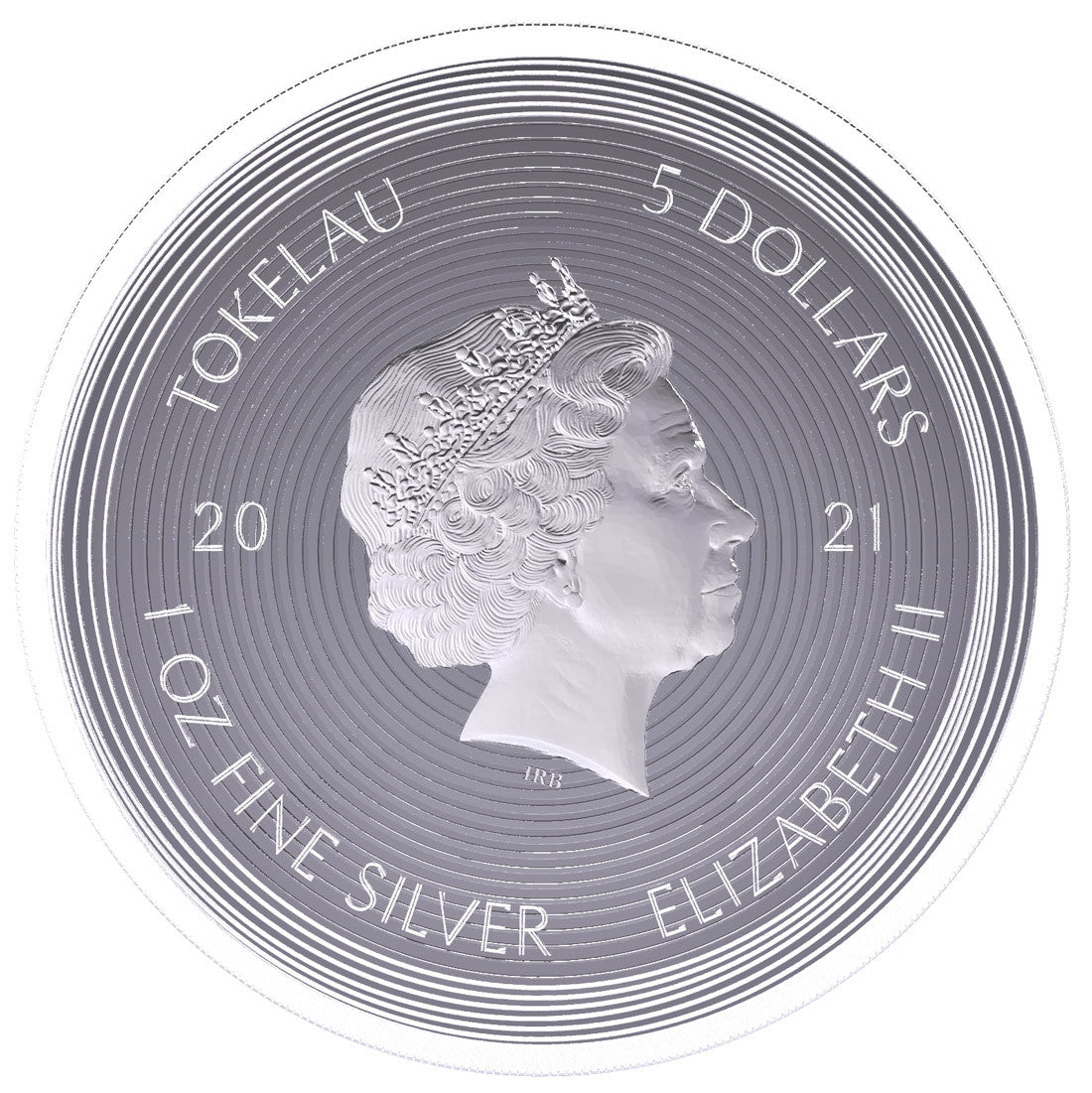 Obverse: “ELIZABETH II”, “TOKELAU”, “5 DOLLARS”, “1 OZ FINE SILVER”, Effigy of Her Majesty Queen Elizabeth II, “2021”, textures